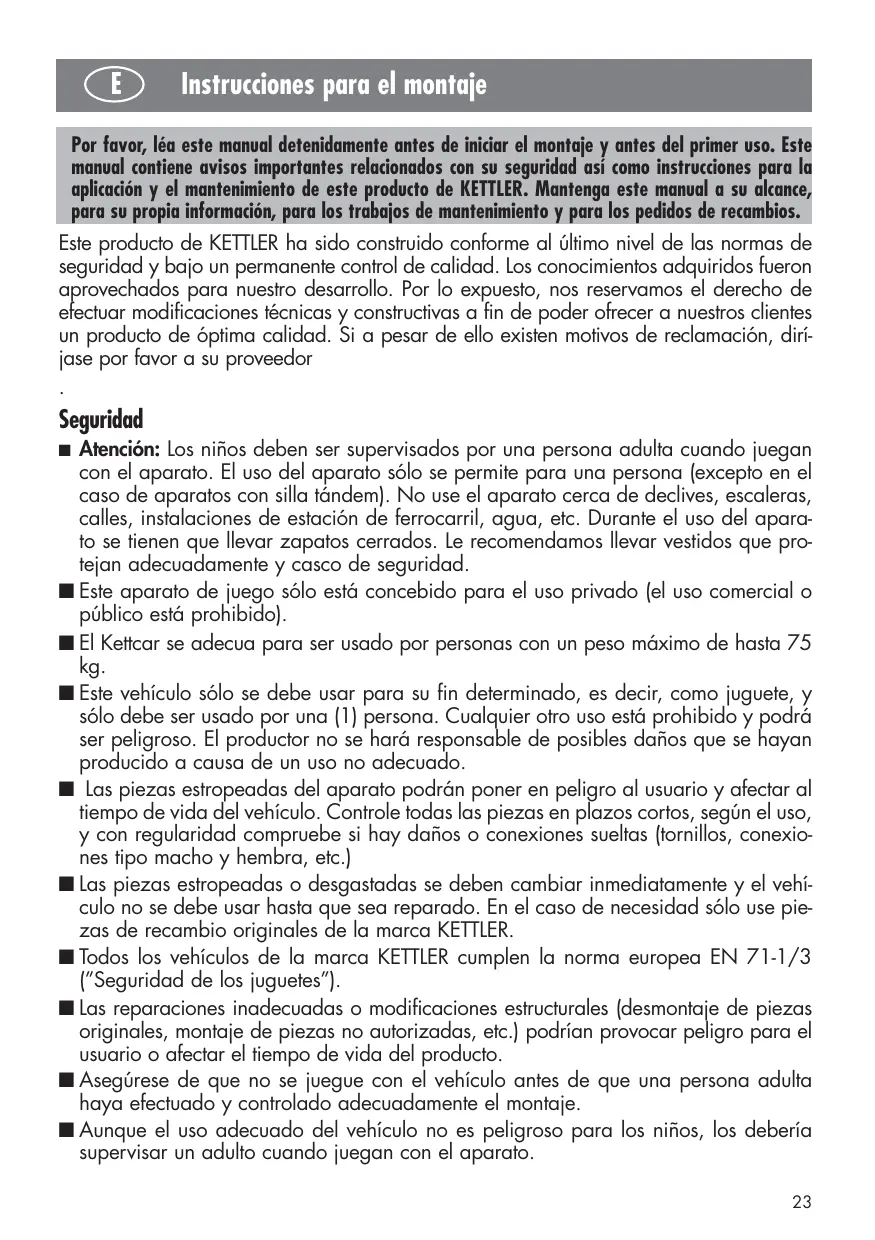 Atención: Los niños deben ser supervisados por una persona adulta cuando juegan con el aparato. El uso del aparato sólo se permite para una persona (excepto en el caso de aparatos con silla tándem). No use el aparato cerca de declives, escaleras, calles, instalaciones de estación de ferrocarril, agua, etc. Durante el uso del aparato se tienen que llevar zapatos cerrados. Le recomendamos llevar vestidos que protejan adecuadamente y casco de seguridad. Este aparato de juego sólo está concebido para el uso privado (el uso comercial o público está prohibido). El Kettcar se adecua para ser usado por personas con un peso máximo de hasta 75 kg. Este vehículo sólo se debe usar para su fin determinado, es decir, como juguete, y sólo debe ser usado por una (1) persona. Cualquier otro uso está prohibido y podrá ser peligroso. El productor no se hará responsable de posibles daños que se hayan producido a causa de un uso no adecuado. Las piezas estropeadas del aparato podrán poner en peligro al usuario y afectar al tiempo de vida del vehículo. Controle todas las piezas en plazos cortos, según el uso, y con regularidad compruebe si hay daños o conexiones sueltas (tornillos, conexiones tipo macho y hembra, etc.) Las piezas estropeadas o desgastadas se deben cambiar inmediatamente y el vehículo no se debe usar hasta que sea reparado. En el caso de necesidad sólo use piezas de recambio originales de la marca KETTLER. Todos los vehículos de la marca KETTLER cumplen la norma europea EN 71-1/3 (”Seguridad de los juguetes”). Las reparaciones inadecuadas o modificaciones estructurales (desmontaje de piezas originales, montaje de piezas no autorizadas, etc.) podrían provocar peligro para el usuario o afectar el tiempo de vida del producto. Asegúrese de que no se juegue con el vehículo antes de que una persona adulta haya efectuado y controlado adecuadamente el montaje. Aunque el uso adecuado del vehículo no es peligroso para los niños, los debería supervisar un adulto cuando juegan con el aparato.
