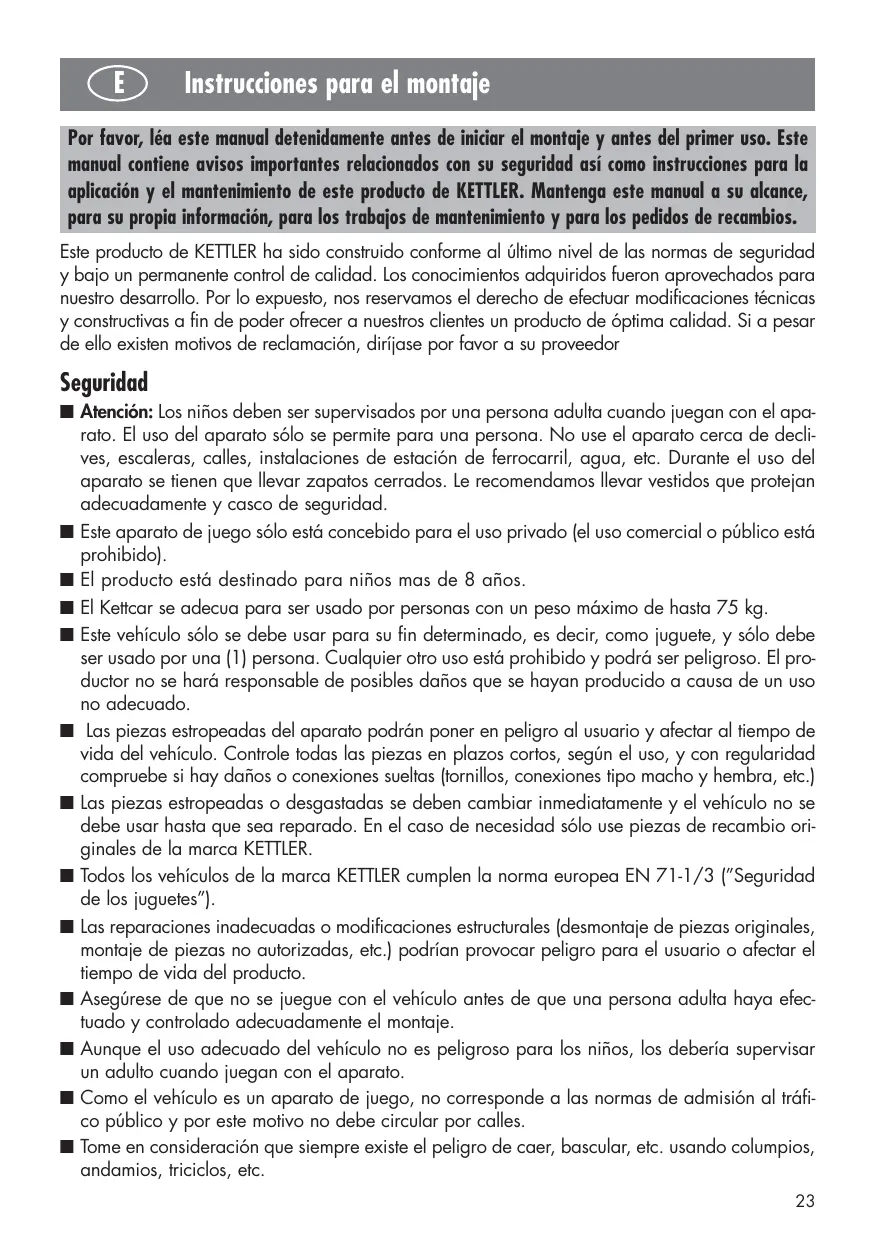 Attention: Ne laissez l’enfant jouer que sous la surveillance d’adultes. L’utilisation du véhicule est autorisée seulement pour une personne. N’utilisez pas le véhicule aux abords de pentes, d’escaliers, de routes, d’installations ferroviaires, de cours d’eau, etc. Pour utiliser le véhicule, il faut porter des chaussures solides et fermées. Nous conseillons également le port de vêtements de protection appropriés et d’un casque de sécurité. L’utilisation n'est autorisée que dans le domaine privé (ne pas d’utilisation commercielle ou public). Le produit est fait pour les enfants plus de 8 ans. Le kart peut être utilisé par les personnes dont le poids maximum ne dépasse pas 75 kg. Ce véhicule ne peut être utilisé que dans le but pour lequel il a été construit, c’est-à-dire en tant que véhicule de jeu dont l’utilisation est prévue pour une seule personne. Toute autre utilisation n’est pas permise et pourrait être dangereuse. Le fabricant ne peut pas être rendu responsable des dommages causés à la suite d’une utilisation dans un but autre que celui prévu. Des éléments de construction endommagés peuvent mettre en danger la sécurité des utilisateurs et nuire à la durabilité du véhicule. Vérifiez régulièrement et à de courts intervalles, en fonction de l’utilisation, si tous les éléments de construction sont en bon état et si certains assemblages ne sont pas desserrés (vis, cavaliers, etc.) Tout élément de construction endommagé ou usé doit être immédiatement remplacé. Le véhicule doit alors être retiré de la circulation jusqu’à sa remise en état. En cas de besoin, veillez à n’utiliser que des pièces de rechange d’origine de la société KETTLER. Tous les véhicules de KETTLER conforment à la norme EN 71-1/3 (Norme européenne de la sècuritée des jouets). Toute réparation incorrecte ou modification de construction (démontage de pièces d’origine, construction de pièces non autorisées, etc.) peut mettre en danger la sécurité de l’utilisateur et nuire à la durabilité du véhicule. Avant la mise en circulation du véhicule, assurez-vous si l’assemblage a été exécuté correctement et contrôlé par un adulte. Bien qu’une utilisation correcte et appropriée exclue pratiquement tout risque pour les enfants, ne laissez pas les enfants jouer sans surveillance. S’agissant d’un véhicule de jeu, ce véhicule ne répond pas aux normes d’agrément pour la circulation sur la voie publique. Il ne peut donc pas circuler sur la voie publique. 13