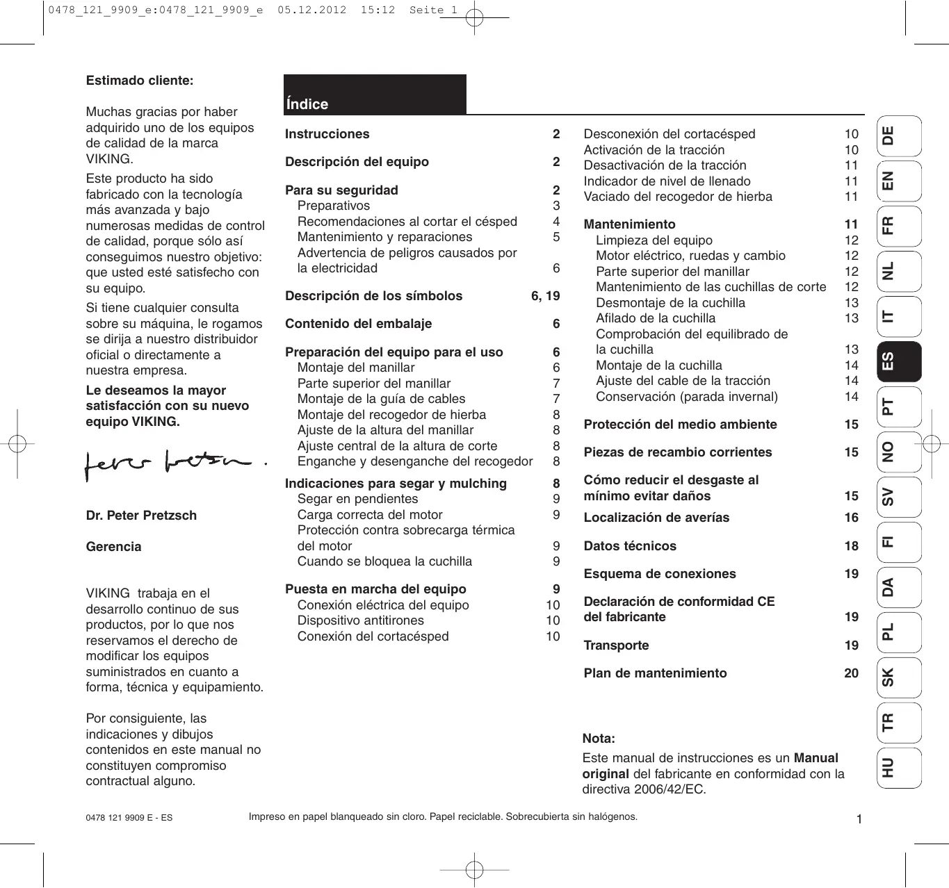 Este manual de instrucciones es un Manual original del fabricante en conformidad con la directiva 2006/42/EC.