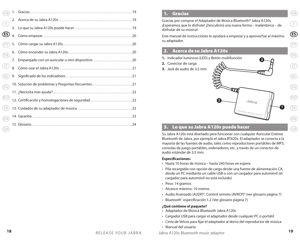 GB Gracias por comprar el Adaptador de Música Bluetooth® Jabra A120s.