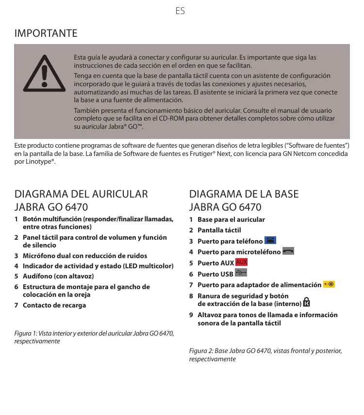 IMPORTANTE Este producto contiene programs de software de fuentes que generan diseños de letra legibles ("Software de fuentes”) en la pantalla de la base. La familia de Software de fuentes es Frutiger* Next, con licencia para GN Netcom concedida