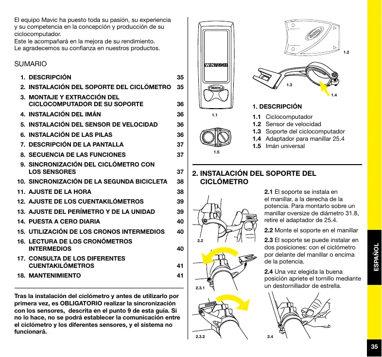 El equipo Mavic ha puesto toda su pasión, su experiencia y su competencia en la concepción y producción de su ciclocomputador. Este le acompañará en la mejora de su rendimiento. Le agradecemos su confianza en nuestros productos.
