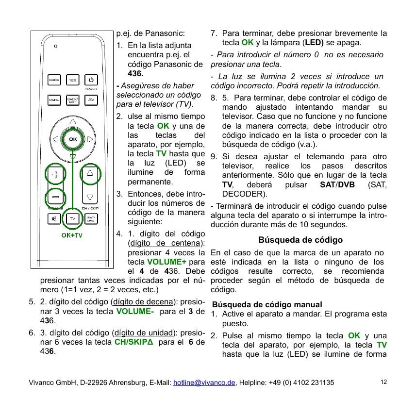 - Asegúrese de haber código incorrecto. Podrá repetir la introducción. seleccionado un código 8. 5. Para terminar, debe controlar el código de para el televisor (TV). mando ajustado intentando mandar su 2. ulse al mismo tiempo televisor. Caso que no funcione y no funcione la tecla OK y una de de la manera correcta, debe introducir otro las teclas del código indicado en la lista o proceder con la aparato, por ejemplo, búsqueda de código (v.a.). la tecla TV hasta que 9. Si desea ajustar el telemando para otro la luz (LED) se televisor, realice los pasos descritos ilumine de forma anteriormente. Sólo que en lugar de la tecla permanente. TV, deberá pulsar SAT/DVB (SAT, 3. Entonces, debe introDECODER). ducir los números de - Terminará de introducir el código cuando pulse código de la manera alguna tecla del aparato o si interrumpe la introsiguiente: ducción durante más de 10 segundos. 4. 1. dígito del código Búsqueda de código (dígito de centena): presionar 4 veces la En el caso de que la marca de un aparato no tecla VOLUME+ para esté indicada en la lista o ninguno de los el 4 de 436. Debe códigos resulte correcto, se recomienda presionar tantas veces indicadas por el nú- proceder según el método de búsqueda de mero (1=1 vez, 2 = 2 veces, etc.) código. 5. 2. dígito del código (dígito de decena): presio- Búsqueda de código manual nar 3 veces la tecla VOLUME- para el 3 de 1. Active el aparato a mandar. El programa esta 436. puesto. 6. 3. dígito del código (dígito de unidad): presio- 2. Pulse al mismo tiempo la tecla OK y una nar 6 veces la tecla CH/SKIPΔ para el 6 de tecla del aparato, por ejemplo, la tecla TV 436. hasta que la luz (LED) se ilumine de forma Vivanco GmbH, D-22926 Ahrensburg, E-Mail: hotline@vivanco.de, Helpline: +49 (0) 4102 231135