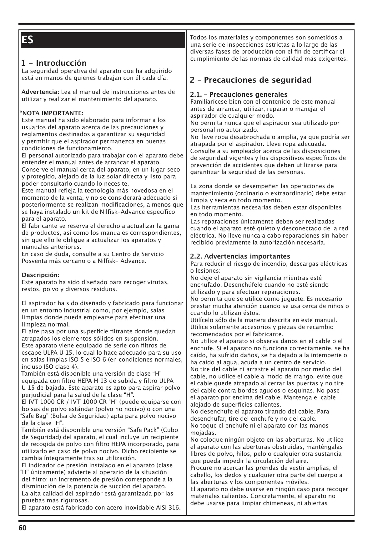 Het filterpatroon en de pakkingen verwijderen en vervangen Schroef de vier schroeven los. Til de roestvrij stalen behuizing met het filterpatroon op. Vervang het filterpatroon en de pakkingen. Plaats de behuizing terug door op de bovenkant ervan te drukken en de vier schroeven terug vast te schroeven. Monteer de handgreep terug en zet vast met de 2 schroeven. De gedemonteerde en vervangen uitblaasfilter moet worden opgeborgen in een plastic tas en moet op de gepaste manier worden weggeruimd. Wees bijzonder voorzichtig bij het vervangen van de hoofdfilter en uitblaasfilter, en draag in ieder geval een masker type P3. Opmerking De uitblaasfilter wordt beschouwd als giftig afval en moet ook als dusdanig worden behandeld. Le présent manuel a été rédigé afin dʼinformer les utilisateurs de la machine sur les précautions et les réglementations relatives à leur sécurité, et de maintenir lʼaspirateur en bon état de fonctionnement. Le personnel autorisé à travailler avec la machine doit comprendre le manuel avant de la mettre en marche. Garder le manuel à proximité de la machine, à un emplacement sec et protégé, non exposé à la lumière directe du soleil et immédiatement disponible pour être consulté au besoin. Le présent manuel reflète lʼétat le plus récent de la technologie au moment de la vente et ne peut pas être considéré comme approprié en cas de modifications ultérieures, sauf si un kit Nilfisk- Advance a été installé sur la machine. Le fabricant se réserve le droit de mettre à jour sa gamme de production et les manuels qui sʼy rapportent sans être tenu de mettre à jour les machines et manuels précédemment fournis. Consulter le centre de service après-vente le plus proche ou Nilfisk-Advance en cas de doute. Description : Cette machine a été conçue pour ramasser les copeaux, les débris, la poussière et autres déchets. Lʼaspirateur a été conçu et construit pour fonctionner en environnement industriel tel quʼune salle blanche où il peut servir au nettoyage normal. De lʼair passe à travers une surface filtrante où les solides en suspension sont retenus. En version standard, la machine est équipée de filtres de refoulement ULPA U 15 qui rendent la machine apte à une utilisation en salles blanches ISO 5 ET ISO 6 (en conditions normales, même ISO classe 4). Une version de classe « H » équipée dʼun filtre amont HEPA H 13 et dʼun filtre aval ULPA U 15 est également disponible. En classe « H », cette machine convient aussi contre les poussières présentant un risque pour la santé. Les modèles IVT 1000 CR / IVT 1000 CR «H» peuvent être équipé dʼun sac à poussière standard (poussière non dangereuse) ou dʼun « sac de sécurité » convenant à la poussière dangereuse en classe « H ». Une version « Safe Pack » de la machine est également disponible - celle-ci comporte un bac de ramassage de la poussière avec filtre HEPA intégré, utilisable pour la poussière dangereuse. Le bac complet est remplacé après usage. La jauge de pression installée sur la machine (classe « H » uniquement) prévient lʼopérateur de lʼétat du filtre : une augmentation de pression représente une réduction de la puissance dʼaspiration de la machine La qualité élevée de lʼaspirateur est garantie par les tests les plus sévères.