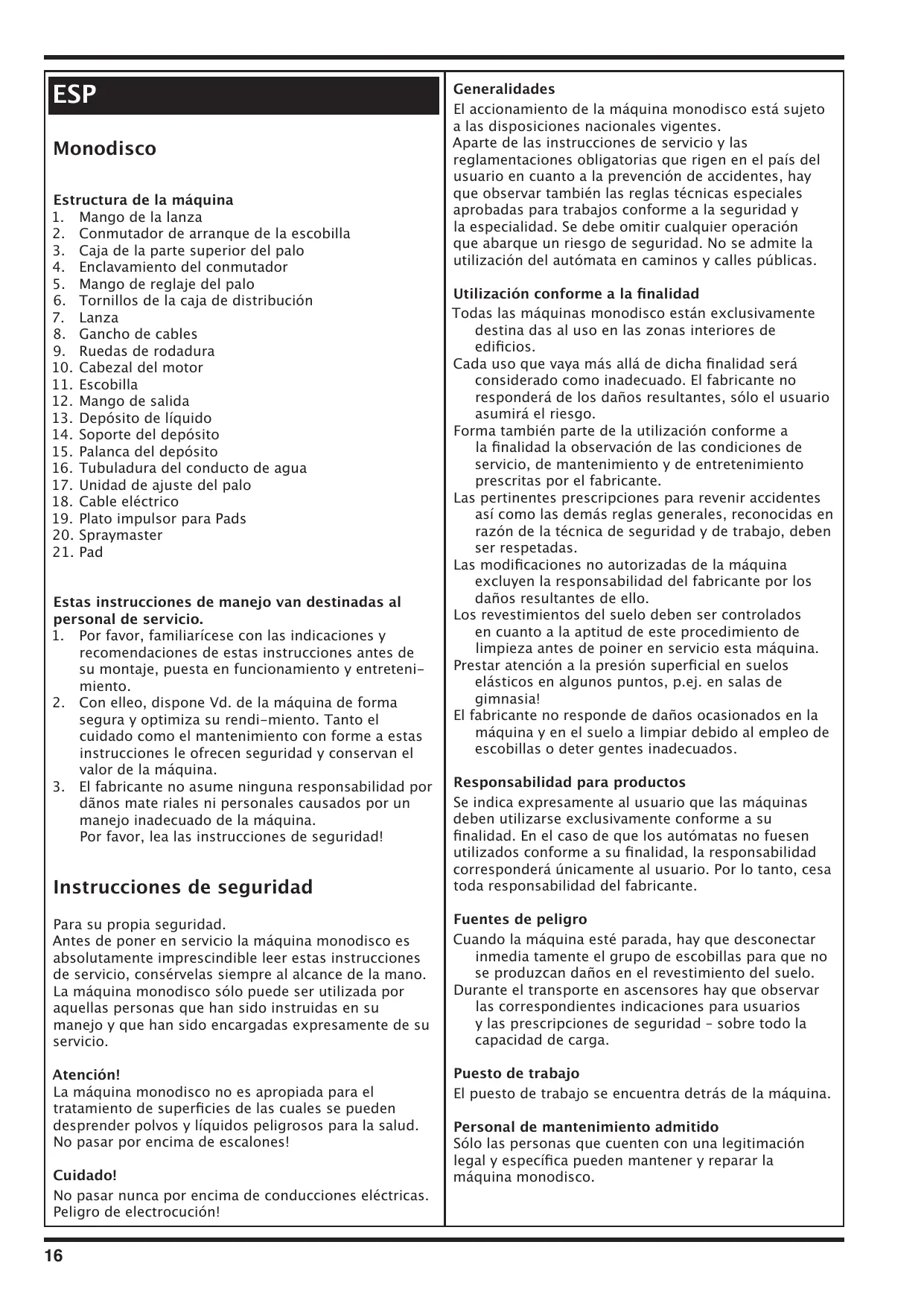 La máquina monodisco no es apropiada para el tratamiento de superficies de las cuales se pueden desprender polvos y líquidos peligrosos para la salud. No pasar por encima de escalones! El puesto de trabajo se encuentra detrás de la máquina.