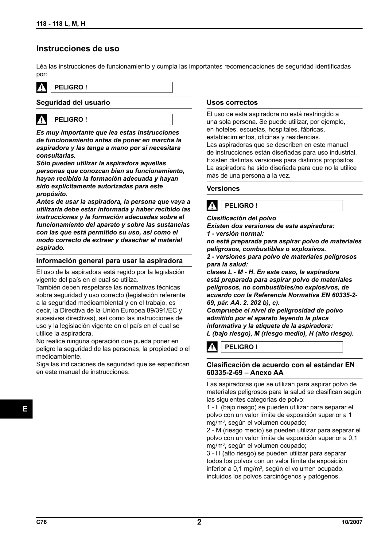 Clases M - H aptas para aspirar polvos de materiales peligrosos y/o carcinógenos. Estos elementos se deben desechar en bolsas selladas, según la normativa aplicable y de acuerdo con la legislación local sobre el desecho de estos materiales. Este procedimiento debe seguirse también cuando se eliminan los filtros (filtros primario y absoluto). 10/2007