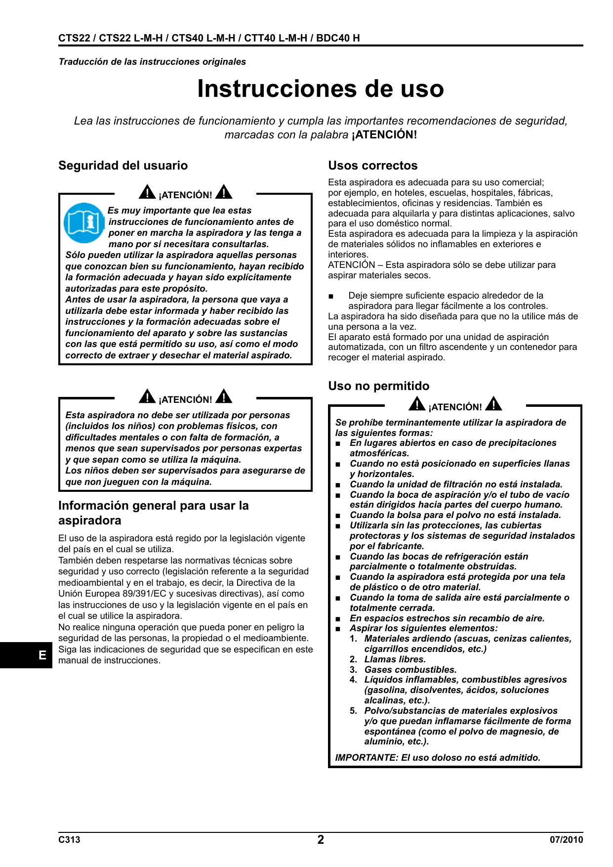 ¡ATENCIÓN! Es muy importante que lea estas instrucciones de funcionamiento antes de poner en marcha la aspiradora y las tenga a mano por si necesitara consultarlas. Sólo pueden utilizar la aspiradora aquellas personas que conozcan bien su funcionamiento, hayan recibido la formación adecuada y hayan sido explícitamente autorizadas para este propósito. Antes de usar la aspiradora, la persona que vaya a utilizarla debe estar informada y haber recibido las instrucciones y la formación adecuadas sobre el funcionamiento del aparato y sobre las sustancias con las que está permitido su uso, así como el modo correcto de extraer y desechar el material aspirado.