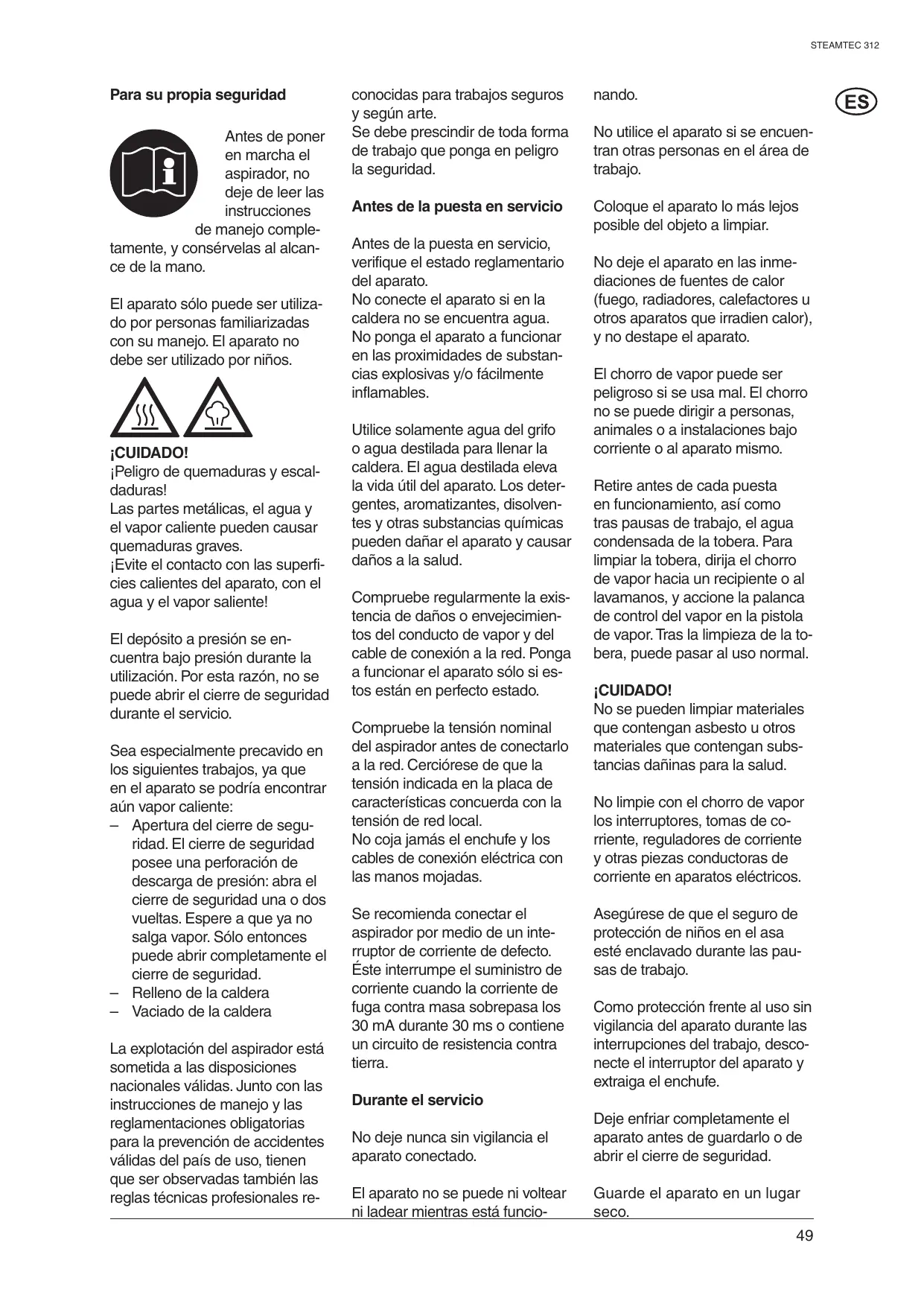 ¡Peligro de quemaduras y escaldaduras! Las partes metálicas, el agua y el vapor caliente pueden causar quemaduras graves. ¡Evite el contacto con las superficies calientes del aparato, con el agua y el vapor saliente! El depósito a presión se encuentra bajo presión durante la utilización. Por esta razón, no se puede abrir el cierre de seguridad durante el servicio. Sea especialmente precavido en los siguientes trabajos, ya que en el aparato se podría encontrar aún vapor caliente: – Apertura del cierre de seguridad. El cierre de seguridad posee una perforación de descarga de presión: abra el cierre de seguridad una o dos vueltas. Espere a que ya no salga vapor. Sólo entonces puede abrir completamente el cierre de seguridad. – Relleno de la caldera – Vaciado de la caldera La explotación del aspirador está sometida a las disposiciones nacionales válidas. Junto con las instrucciones de manejo y las reglamentaciones obligatorias para la prevención de accidentes válidas del país de uso, tienen que ser observadas también las reglas técnicas profesionales re-