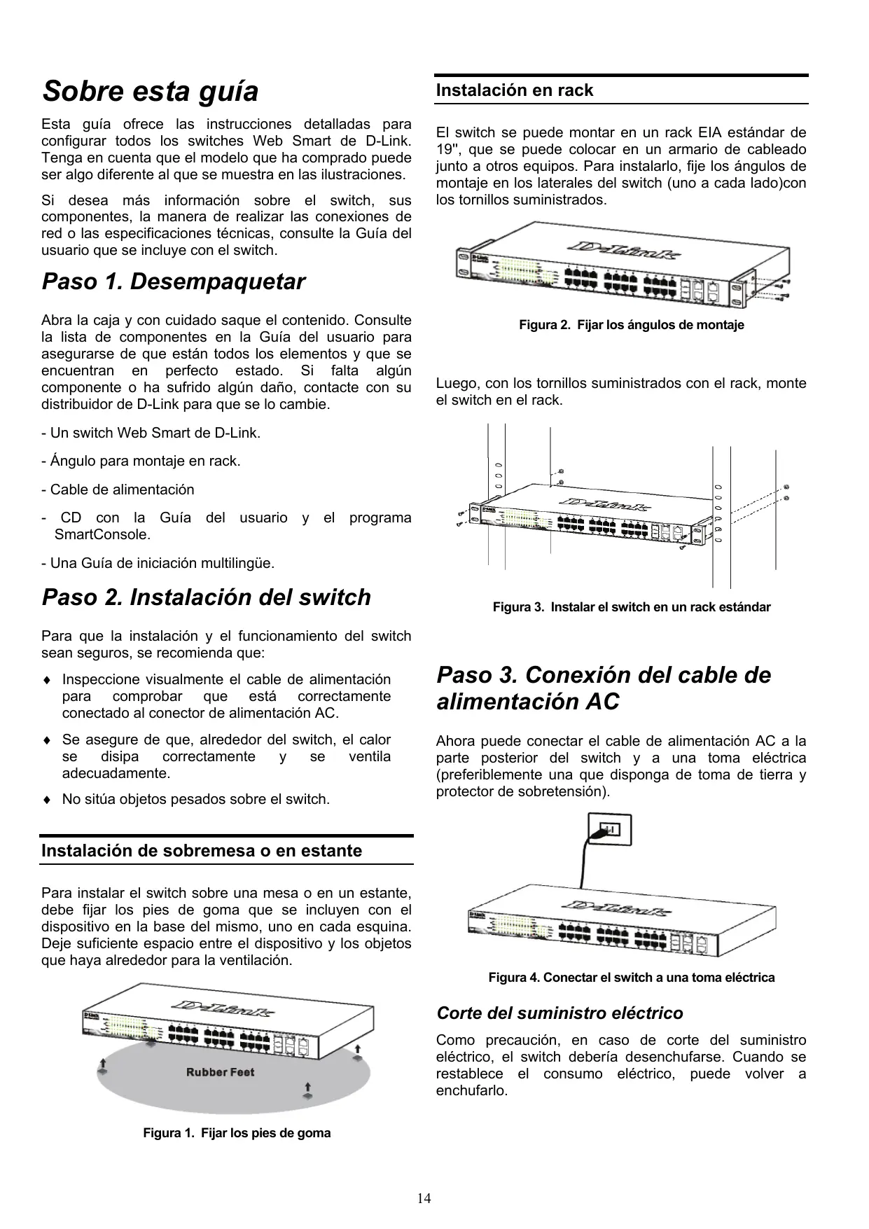 Para instalar el switch sobre una mesa o en un estante, debe FIRar los pies de goma que se incluyen con el dispositivo en la base del本身就是, uno en cada esquina. Deje suficiente espacio entre el dispositivo y los objetos que haya alrededor para la ventilacion.