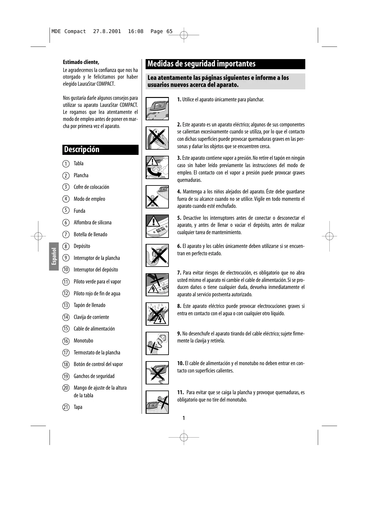 - Riempire la caldaia Estimado cliente, Le agradecemos la confianza que nos ha otorgado y le felicitamos por haber elegido LauraStar COMPACT. Nos gustaría darle algunos consejos para utilizar su aparato LauraStar COMPACT. Le rogamos que lea atentamente el modo de empleo antes de poner en marcha por primera vez el aparato. Español Descripción
