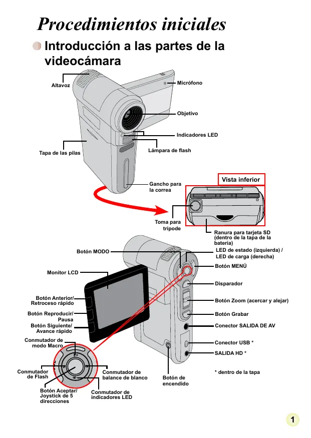 - Requisitos del sistema Procedimientos iniciales Introducción a las partes de la videocámara Micrófono Altavoz Objetivo Indicadores LED Lámpara de flash Tapa de las pilas Gancho para la correa Toma para trípode Botón MODO Vista inferior Ranura para tarjeta SD (dentro de la tapa de la batería) LED de estado (izquierda) / LED de carga (derecha) Botón MENÚ Monitor LCD Disparador Botón Anterior/ Retroceso rápido Botón Zoom (acercar y alejar) Botón Reproducir/ Pausa Botón Siguiente/ Avance rápido Botón Grabar Conector SALIDA DE AV Conmutador de modo Macro Conmutador de Flash Botón Aceptar/ Joystick de 5 direcciones Conmutador de balance de blanco Botón de encendido p. 18