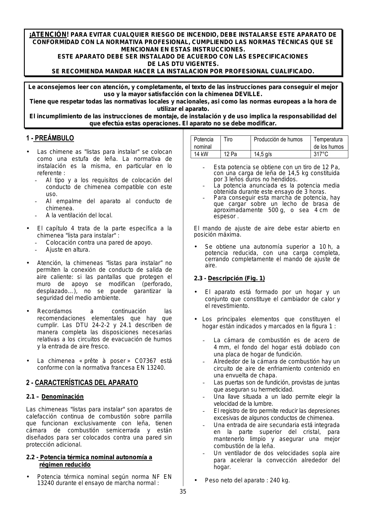 ¡ATENCIÓN! PARA EVITAR CUALQUIER RIESGO DE INCENDIO, DEBE INSTALARSE ESTE APARATO DE CONFORMIDAD CON LA NORMATIVA PROFESIONAL, CUMPLIENDO LAS NORMAS TÉCNICAS QUE SE MENCIONAN EN ESTAS INSTRUCCIONES. ESTE APARATO DEBE SER INSTALADO DE ACUERDO CON LAS ESPECIFICACIONES DE LAS DTU VIGENTES. SE RECOMIENDA MANDAR HACER LA INSTALACION POR PROFESIONAL CUALIFICADO. Le aconsejemos leer con atención, y completamente, el texto de las instrucciones para conseguir el mejor uso y la mayor satisfacción con la chimenea DEVILLE. Tiene que respetar todas las normativas locales y nacionales, asi como las normas europeas a la hora de utilizar el aparato. El incumplimiento de las instrucciones de montaje, de instalación y de uso implica la responsabilidad del que efectúa estas operaciones. El aparato no se debe modificar.
