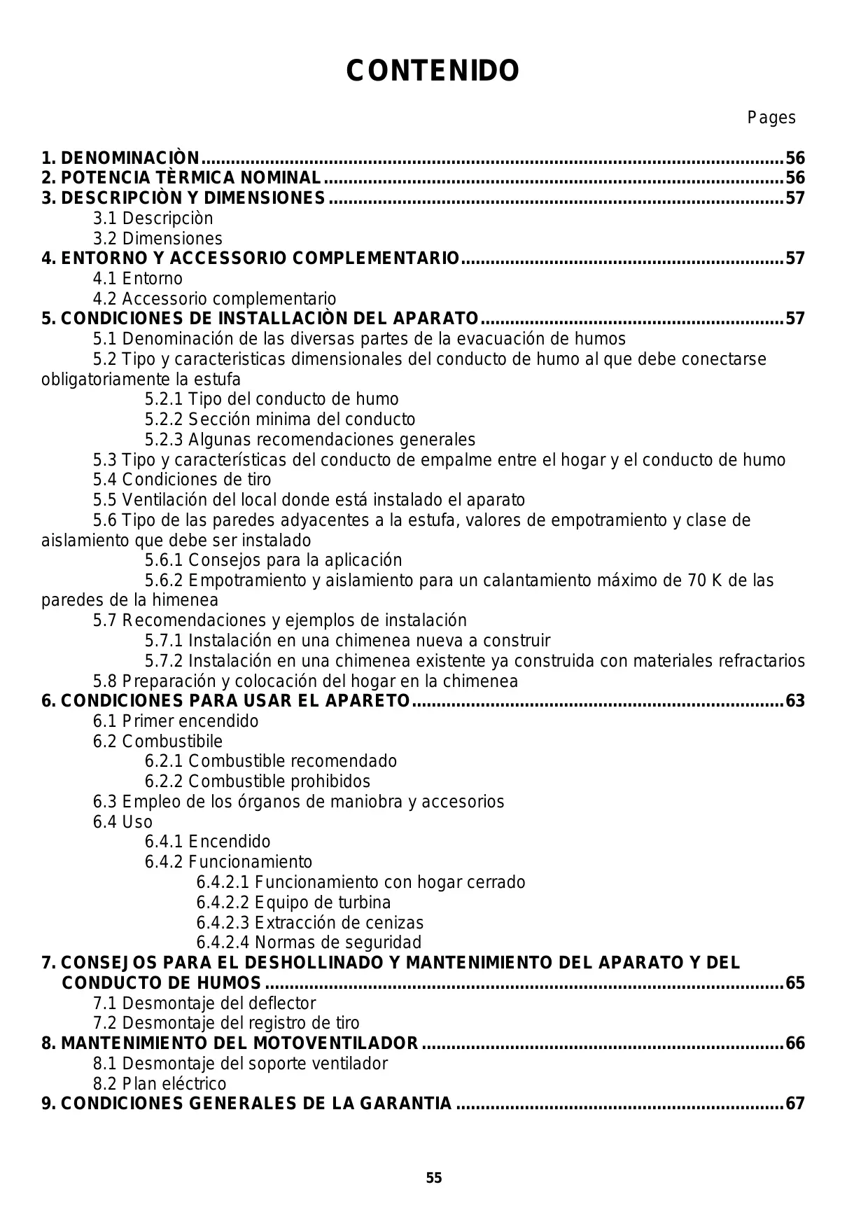 CONTENIDO Pages 1. DENOMINACIÒN.......................................................................................................................56 2. POTENCIA TÈRMICA NOMINAL..............................................................................................56 3. DESCRIPCIÒN Y DIMENSIONES .............................................................................................57