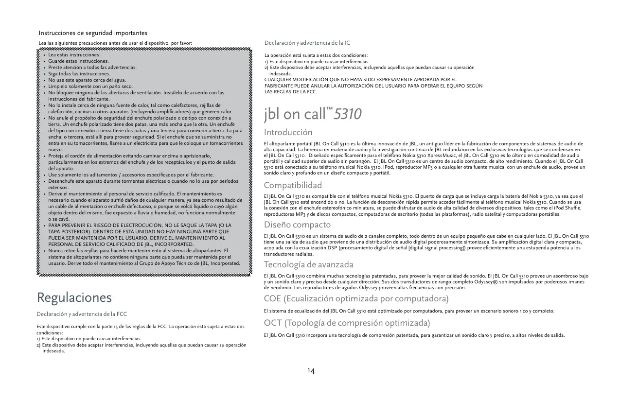 indeseada. CUALQUIER MODIFICACIÓN QUE NO HAYA SIDO EXPRESAMENTE APROBADA POR EL FABRICANTE PUEDE ANULAR LA AUTORIZACIÓN DEL USUARIO PARA OPERAR EL EQUIPO SEGÚN LAS REGLAS DE LA FCC. jbl on call™5310 Introducción El altoparlante portátil JBL On Call 5310 es la última innovación de JBL, un antiguo líder en la fabricación de componentes de sistemas de audio de alta capacidad. La herencia en materia de audio y la investigación continua de JBL redundaron en las exclusivas tecnologías que se condensan en el JBL On Call 5310. Diseñado específicamente para el teléfono Nokia 5310 XpressMusic, el JBL On Call 5310 es lo último en comodidad de audio portátil y calidad superior de audio sin parangón. El JBL On Call 5310 es un centro de audio compacto, de alto rendimiento. Cuando el JBL On Call 5310 está conectado a su teléfono musical Nokia 5310, iPod, reproductor MP3 o a cualquier otra fuente musical con un enchufe de audio, provee un sonido claro y profundo en un diseño compacto y portátil. Compatibilidad El JBL On Call 5310 es compatible con el teléfono musical Nokia 5310. El puerto de carga que se incluye carga la batería del Nokia 5310, ya sea que el JBL On Call 5310 esté encendido o no. La función de desconexión rápida permite acceder fácilmente al teléfono musical Nokia 5310. Cuando se usa la conexión con el enchufe estereofónico miniatura, se puede disfrutar de audio de alta calidad de diversos dispositivos, tales como el iPod Shuffle, reproductores MP3 y de discos compactos, computadoras de escritorio (todas las plataformas), radio satelital y computadoras portátiles. Diseño compacto El JBL On Call 5310 es un sistema de audio de 2 canales completo, todo dentro de un equipo pequeño que cabe en cualquier lado. El JBL On Call 5310 tiene una salida de audio que proviene de una distribución de audio digital poderosamente sintonizada. Su amplificación digital clara y compacta, acoplada con la ecualización DSP (procesamiento digital de señal [digital signal processing]) provee eficientemente una estupenda potencia a los transductores radiales. Tecnología de avanzada El JBL On Call 5310 combina muchas tecnologías patentadas, para proveer la mejor calidad de sonido. El JBL On Call 5310 provee un asombroso bajo y un sonido claro y preciso desde cualquier dirección. Sus dos transductores de rango completo Odyssey® son impulsados por poderosos imanes de neodimio. Los reproductores de agudos Odyssey proveen altas frecuencias con precisión. COE (Ecualización optimizada por computadora) El sistema de ecualización del JBL On Call 5310 está optimizado por computadora, para proveer un escenario sonoro rico y completo. OCT (Topología de compresión optimizada) El JBL On Call 5310 incorpora una tecnología de compresión patentada, para garantizar un sonido claro y preciso, a altos niveles de salida.
