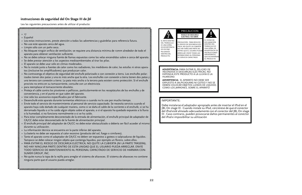Español Lea estas instrucciones, preste atención a todas las advertencias y guárdelas para referencia futura. No use este aparato cerca del agua. Limpie sólo con un paño seco. No bloquee ningún orificio de ventilación; se requiere una distancia mínima de 10mm alrededor de todo el aparato para obtener ventilación suficiente. No se debe colocar ninguna fuente de llamas expuestas como las velas encendidas sobre o cerca del aparato. Se debe prestar atención a los aspectos medioambientales al tirar las pilas. El aparato se debe usar sólo en climas moderados. No lo instale junto a fuentes de calor como los radiadores, los medidores de calor, las estufas ni otros aparatos (inclusive los amplificadores) que produzcan calor. No contravenga el objetivo de seguridad del enchufe polarizado o con conexión a tierra. Los enchufes polarizados tienen dos patas y una es más ancha que la otra. Los enchufes con conexión a tierra tienen dos patas y una tercera con conexión a tierra. La pata más ancha o la tercera pata existen como protección. Si el enchufe provisto no entra en su tomacorriente, consulte con un electricista para reemplazar el tomacorriente obsoleto. Proteja el cable contra los pisotones o pellizcos, particularmente en los receptáculos de los enchufes y de conveniencia, y en el punto en que salen del aparato. Use sólo los accesorios especificados por el fabricante. Desenchufe este aparato durante tormentas eléctricas o cuando no lo use por mucho tiempo. Envíe todo el servicio de mantenimiento al personal de servicio capacitado. Se necesita servicio cuando el aparato haya sido dañado de cualquier manera, como si se daña el cable de la corriente o el enchufe, si se ha derramado líquido o si ha caído algún objeto sobre el aparato, o si el aparato ha quedado expuesto a la lluvia o la humedad, si no funciona normalmente o si se ha caído. Para estar completamente desconectado de la entrada de alimentación, el enchufe principal de adaptador de CA/CC debe estar desconectado de la fuente de alimentación principal. El enchufe principal del adaptador de CA/CC no debe estar obstaculizado o debería ser fácil acceder al mismo durante su utilización. La información técnica se encuentra en la parte inferior del aparato. La batería no debe ser expuesta al calor excesivo (producto del sol, fuego o similares). Tanto el aparato como el adaptador de CA/CC no deben ser expuestos a goteos o salpicaduras de líquidos. Tampoco se debe colocar ningún objeto que contenga líquidos, por ejemplo un florero, sobre ellos. PARA EVITAR EL RIESGO DE DESCARGA ELÉCTRICA, NO QUITE LA CUBIERTA (NI LA PARTE TRASERA). NO HAY NINGUNA PARTE DENTRO DE ESTA UNIDAD QUE EL USUARIO PUEDA ARREGLAR. ENVÍE TODO SERVICIO DE MANTENIMIENTO AL PERSONAL CAPACITADO DE SERVICIO DE HARMAN CONSUMER GROUP, INC. No quite nunca la tapa de la rejilla para arreglar el sistema de altavoces. El sistema de altavoces no contiene ninguna parte que el usuario pueda arreglar.