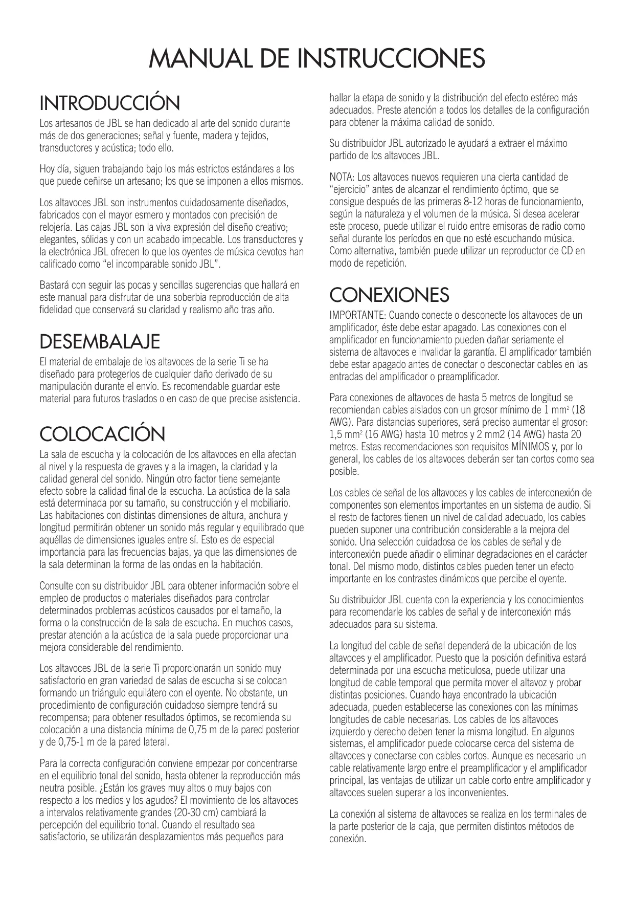 CUIDADOS GENERALES Los altavoces de la serie Ti de JBL están acabados con materiales que mantendrán todas sus propiedades durante muchos años. La limpieza ocasional con un paño suave y limpio permitirá conservar toda su belleza original. Utilice sólo paños de algodón sin pelusa para quitar el polvo. Para eliminar huellas y manchas, puede utilizar un limpiacristales sin amoníaco. Aplique una pequeña cantidad a un paño de algodón sin pelusa y páselo suavemente por la superficie. No utilice limpiadores que contengan abrasivos o agentes químicos agresivos. En caso de rayaduras profundas u otros daños, consulte con un restaurador de muebles cualificado.