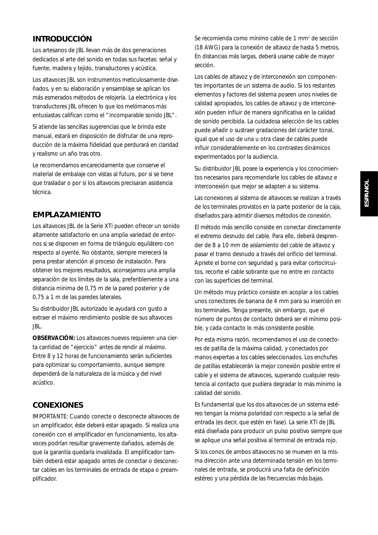 Los artesanos de JBL llevan más de dos generaciones dedicados al arte del sonido en todas sus facetas: señal y fuente, madera y tejido, transductores y acústica. Los altavoces JBL son instrumentos meticulosamente diseñados, y en su elaboración y ensamblaje se aplican los más esmerados métodos de relojería. La electrónica y los transductores JBL ofrecen lo que los melómanos más entusiastas califican como el ”incomparable sonido JBL”. Si atiende las sencillas sugerencias que le brinda este manual, estará en disposición de disfrutar de una reproducción de la máxima fidelidad que perdurará en claridad y realismo un año tras otro. Le recomendamos encarecidamente que conserve el material de embalaje con vistas al futuro, por si se tiene que trasladar o por si los altavoces precisaran asistencia técnica. EMPLAZAMIENTO Los altavoces JBL de la Serie XTi pueden ofrecer un sonido altamente satisfactorio en una amplia variedad de entornos si se disponen en forma de triángulo equilátero con respecto al oyente. No obstante, siempre merecerá la pena prestar atención al proceso de instalación. Para obtener los mejores resultados, aconsejamos una amplia separación de los límites de la sala, preferiblemente a una distancia mínima de 0,75 m de la pared posterior y de 0,75 a 1 m de las paredes laterales. Su distribuidor JBL autorizado le ayudará con gusto a extraer el máximo rendimiento posible de sus altavoces JBL. Se recomienda como mínimo cable de 1 mm2 de sección (18 AWG) para la conexión de altavoz de hasta 5 metros. En distancias más largas, deberá usarse cable de mayor sección. Los cables de altavoz y de interconexión son componentes importantes de un sistema de audio. Si los restantes elementos y factores del sistema poseen unos niveles de calidad apropiados, los cables de altavoz y de interconexión pueden influir de manera significativa en la calidad de sonido percibida. La cuidadosa selección de los cables puede añadir o sustraer gradaciones del carácter tonal, igual que el uso de una u otra clase de cables puede influir considerablemente en los contrastes dinámicos experimentados por la audiencia. Su distribuidor JBL posee la experiencia y los conocimientos necesarios para recomendarle los cables de altavoz e interconexión que mejor se adapten a su sistema. Las conexiones al sistema de altavoces se realizan a través de los terminales provistos en la parte posterior de la caja, diseñados para admitir diversos métodos de conexión. El método más sencillo consiste en conectar directamente el extremo desnudo del cable. Para ello, deberá desprender de 8 a 10 mm de aislamiento del cable de altavoz y pasar el tramo desnudo a través del orificio del terminal. Apriete el borne con seguridad y, para evitar cortocircuitos, recorte el cable sobrante que no entre en contacto con las superficies del terminal. Un método muy práctico consiste en acoplar a los cables unos conectores de banana de 4 mm para su inserción en los terminales. Tenga presente, sin embargo, que el número de puntos de contacto deberá ser el mínimo posible, y cada contacto lo más consistente posible. OBSERVACIÓN: Los altavoces nuevos requieren una cierta cantidad de ”ejercicio” antes de rendir al máximo. Entre 8 y 12 horas de funcionamiento serán suficientes para optimizar su comportamiento, aunque siempre dependerá de la naturaleza de la música y del nivel acústico. Por esta misma razón, recomendamos el uso de conectores de patilla de la máxima calidad, y conectados por manos expertas a los cables seleccionados. Los enchufes de patillas establecerán la mejor conexión posible entre el cable y el sistema de altavoces, superando cualquier resistencia al contacto que pudiera degradar lo más mínimo la calidad del sonido. CONEXIONES Es fundamental que los dos altavoces de un sistema estéreo tengan la misma polaridad con respecto a la señal de entrada (es decir, que estén en fase). La serie XTi de JBL está diseñada para producir un pulso positivo siempre que se aplique una señal positiva al terminal de entrada rojo. IMPORTANTE: Cuando conecte o desconecte altavoces de un amplificador, éste deberá estar apagado. Si realiza una conexión con el amplificador en funcionamiento, los altavoces podrían resultar gravemente dañados, además de que la garantía quedaría invalidada. El amplificador también deberá estar apagado antes de conectar o desconectar cables en los terminales de entrada de etapa o preamplificador. Si los conos de ambos altavoces no se mueven en la misma dirección ante una determinada tensión en los terminales de entrada, se producirá una falta de definición estéreo y una pérdida de las frecuencias más bajas. ESPANOL INTRODUCCIÓN Aconsejamos hacer pruebas con la polaridad de los altavoces, toda vez que las grabaciones, las fuentes de programa o las etapas de potencia pueden invertir la polaridad de la señal. La conexión ”correcta” será aquélla que ofrezca los mejores resultados audibles. Asegúrese de invertir las conexiones izquierda y derecha para conservar la polaridad de los sistemas. BICABLEADO Los altavoces XTi de JBL pueden conectarse al amplificador con dos tendidos de cable por unidad. La conexión ”bicableada” ofrece varias posibilidades y ventajas. ESPANOL Los divisores internos del sistema se separan eléctricamente en la transición de graves a medios/agudos. Unos puentes externos conectan las dos partes del divisor cuando se utiliza el método de cable único. El sistema se entrega de fábrica con los puentes instalados. Sólo tendrá que retirarlos para poder realizar las conexiones a cada una de las secciones del divisor, empleando dos cables (cuatro conductores) como se ilustra en la figura 1. Los cables pueden ser del mismo tipo para las secciones de altas y bajas frecuencias. Las ventajas son la reducción del efecto de cable (resistencia, inductancia, etc.), y la eliminación de la intermodulación de altas y