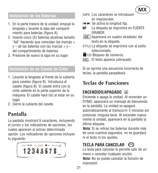 CAPS Los caracteres se introducen Instalación de las Baterías en mayúsculas. lQ-Rl Se activa la longitud fija. BF La etiqueta se imprimirá en FUENTE GRANDE. ABC Aparecerá un cuadro alrededor del texto en la etiqueta. STYLE La etiqueta se imprimirá con el estilo seleccionado. 123 Bloqueo de números. ABC El texto aparece subrayado.