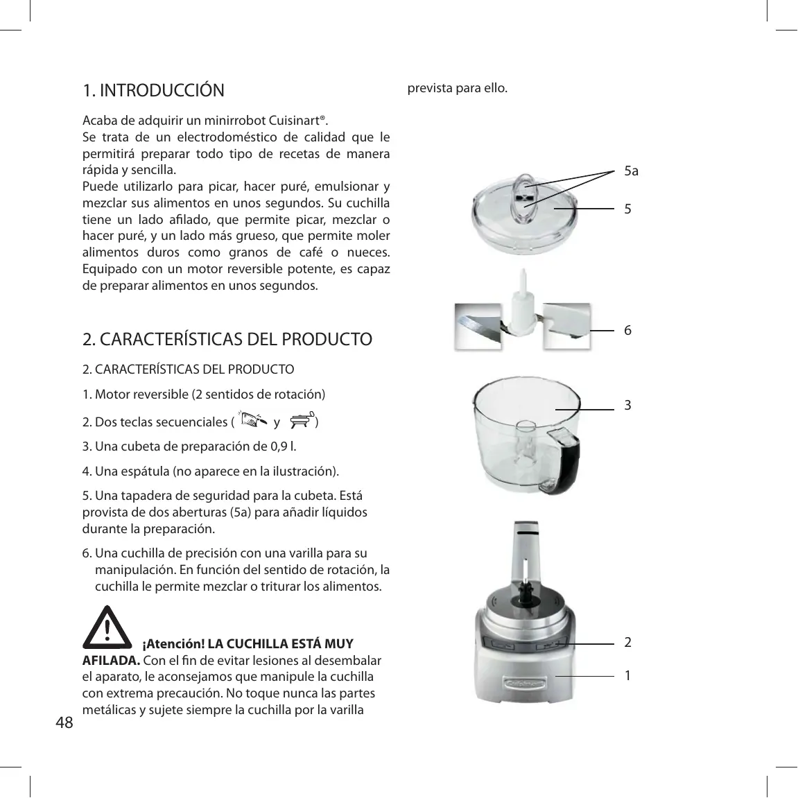 Acaba de adquirir un minirrobot Cuisinart®. Se trata de un electrodoméstico de calidad que le permitirá preparar todo tipo de recetas de manera rápida y sencilla. Puede utilizarlo para picar, hacer puré, emulsionar y mezclar sus alimentos en unos segundos. Su cuchilla tiene un lado afilado, que permite picar, mezclar o hacer puré, y un lado más grueso, que permite moler alimentos duros como granos de café o nueces. Equipado con un motor reversible potente, es capaz de preparar alimentos en unos segundos.