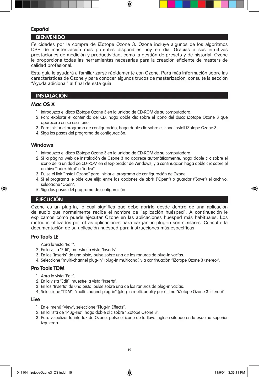 Español BIENVENIDO Felicidades por la compra de iZotope Ozone 3. Ozone incluye algunos de los algoritmos DSP de masterización más potentes disponibles hoy en día. Gracias a sus intuitivas prestaciones de medición y productividad, como la gestión de presets y de historial, Ozone le proporciona todas las herramientas necesarias para la creación eficiente de masters de calidad profesional. Esta guía le ayudará a familiarizarse rápidamente con Ozone. Para más información sobre las características de Ozone y para conocer algunos trucos de masterización, consulte la sección “Ayuda adicional” al final de esta guía. INSTALACIÓN Mac OS X