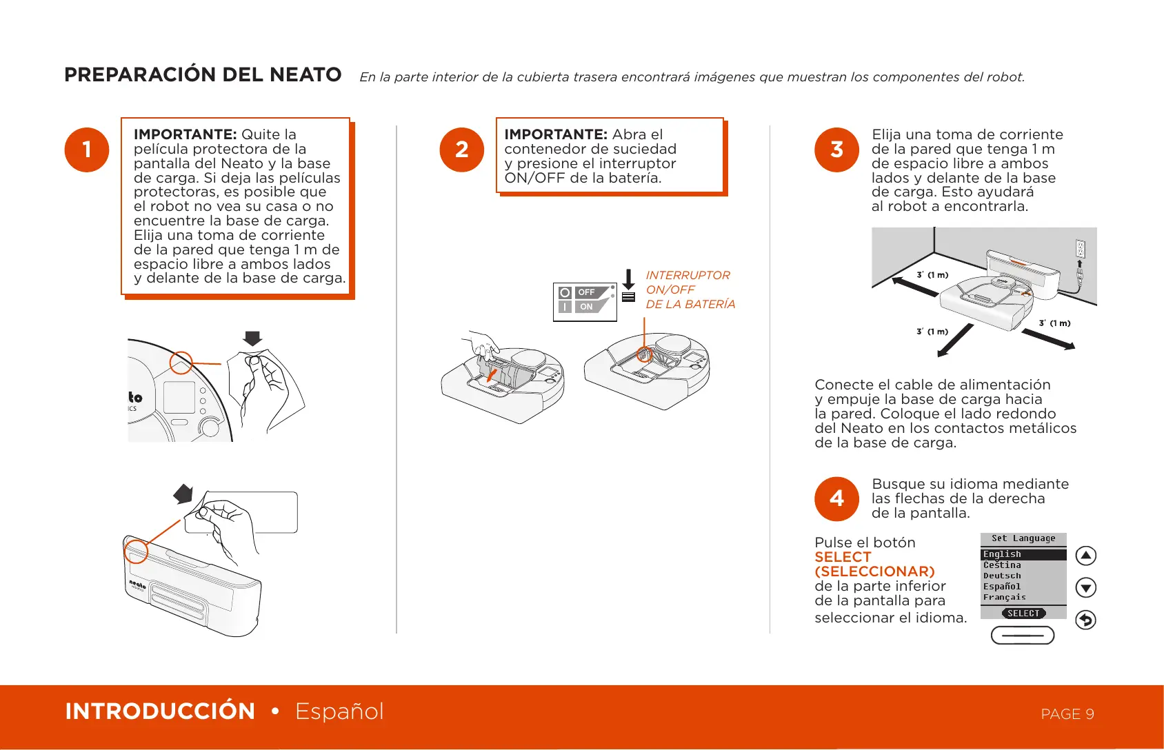 IMPORTANTE: Quite la película protectora de la pantalla del Neato y la base de carga. Si deja las películas protectoras, es posible que el robot no vea su casa o no encuentre la base de carga.