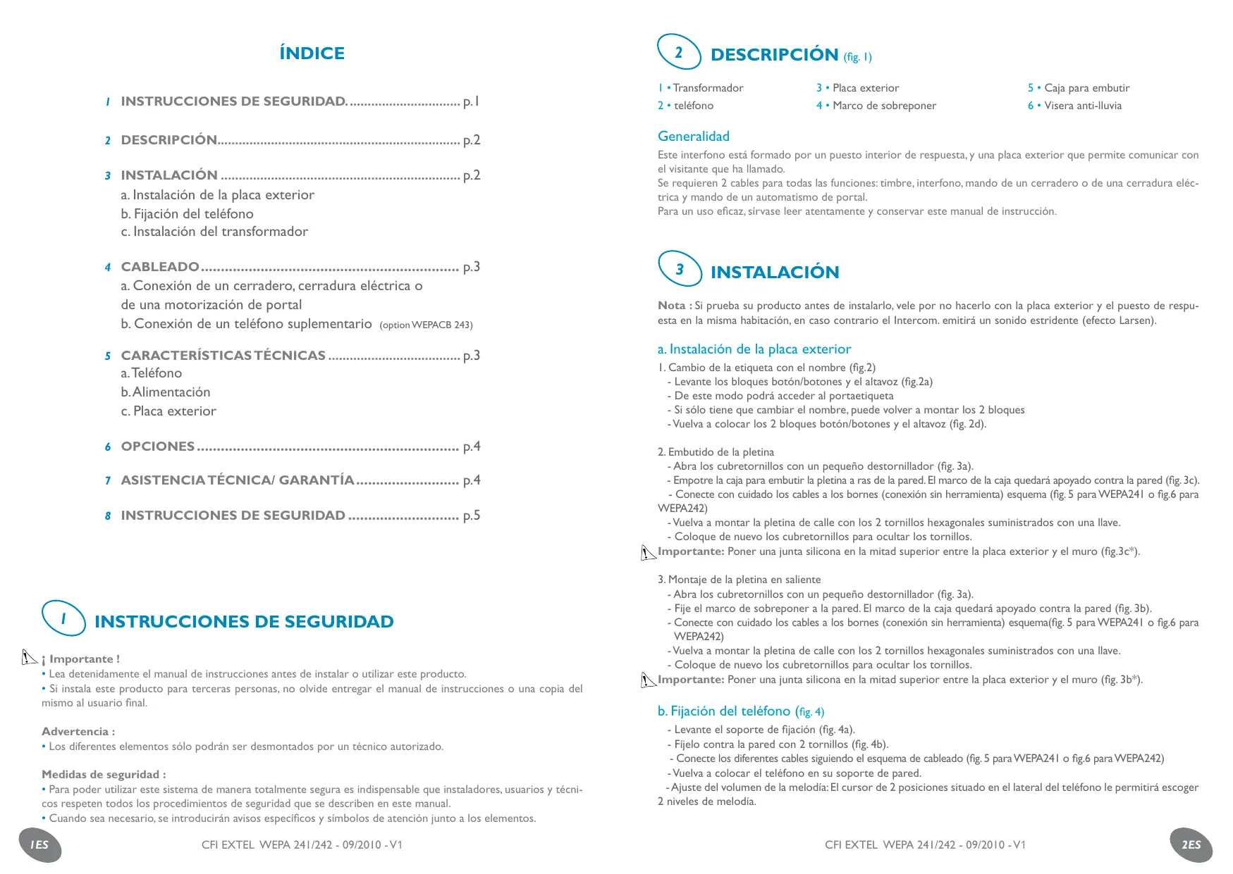 Mesures DE SéCURITé 1 INSTRUCCIONES DE SEGURIDAD................................. p.1 1 • Transformador 2 • teléfono 2 DESCRIPCIÓN..................................................................... p.2 Generalidad 3 INSTALACIÓN.................................................................... p.2 a. Instalación de la placa exterior b. Fijación del teléfono c. Instalación del transformador 4 CABLEADO. ................................................................ p.3 a. Conexión de un cerradero, cerradura eléctrica o de una motorización de portal b. Conexión de un teléfono suplementario (option WEPACB 243) 5 CARACTERÍSTICAS TÉCNICAS...................................... p.3 a. Teléfono b. Alimentación c. Placa exterior