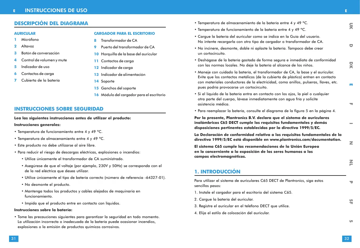 1. INTRODUCCIÓN Para utilizar el sistema de auriculares C65 DECT de Plantronics, siga estos sencillos pasos: