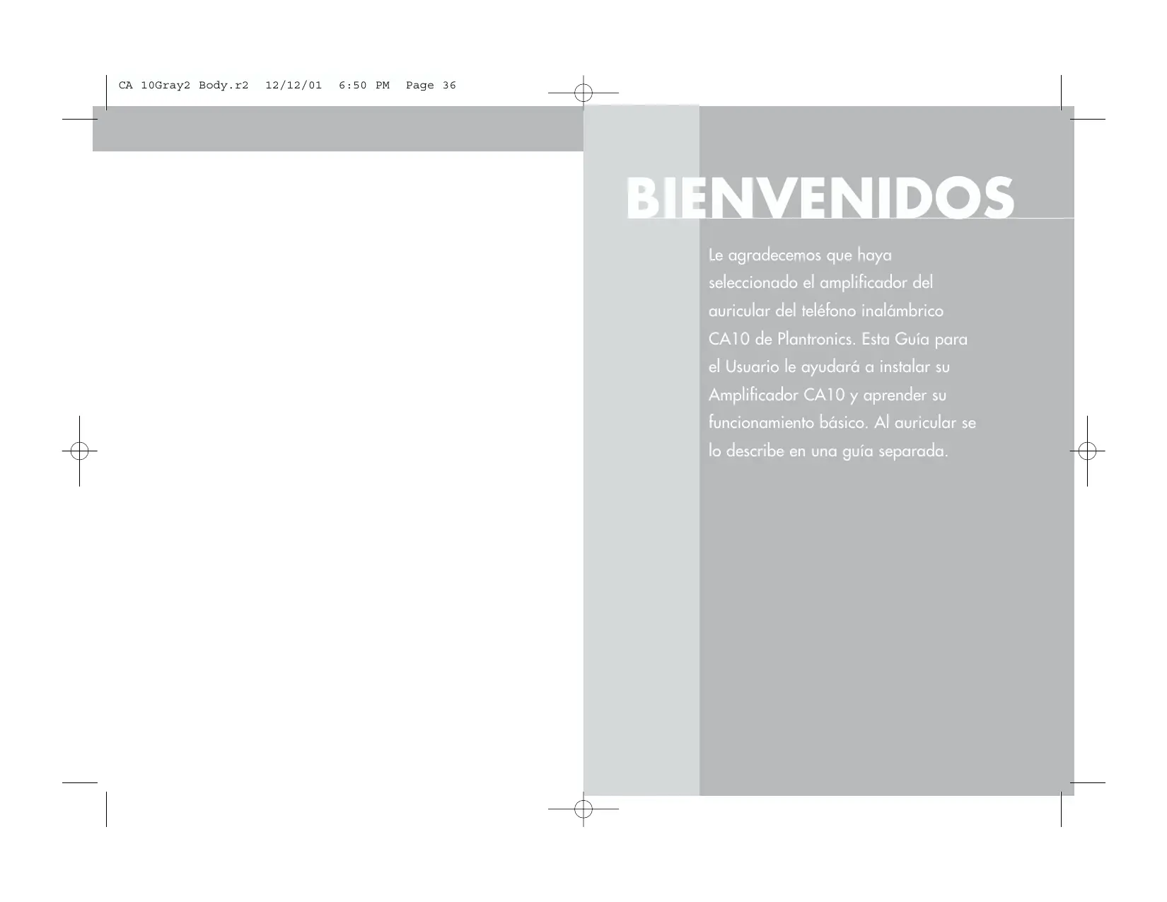 BIENVENIDOS Le agradecemos que haya seleccionado el amplificador del auricular del teléfono inalámbrico CA10 de Plantronics. Esta Guía para el Usuario le ayudará a instalar su Amplificador CA10 y aprender su funcionamiento básico. Al auricular se lo describe en una guía separada. CA 10Gray2 Body.r2 12/12/01 6:50 PM Page 38