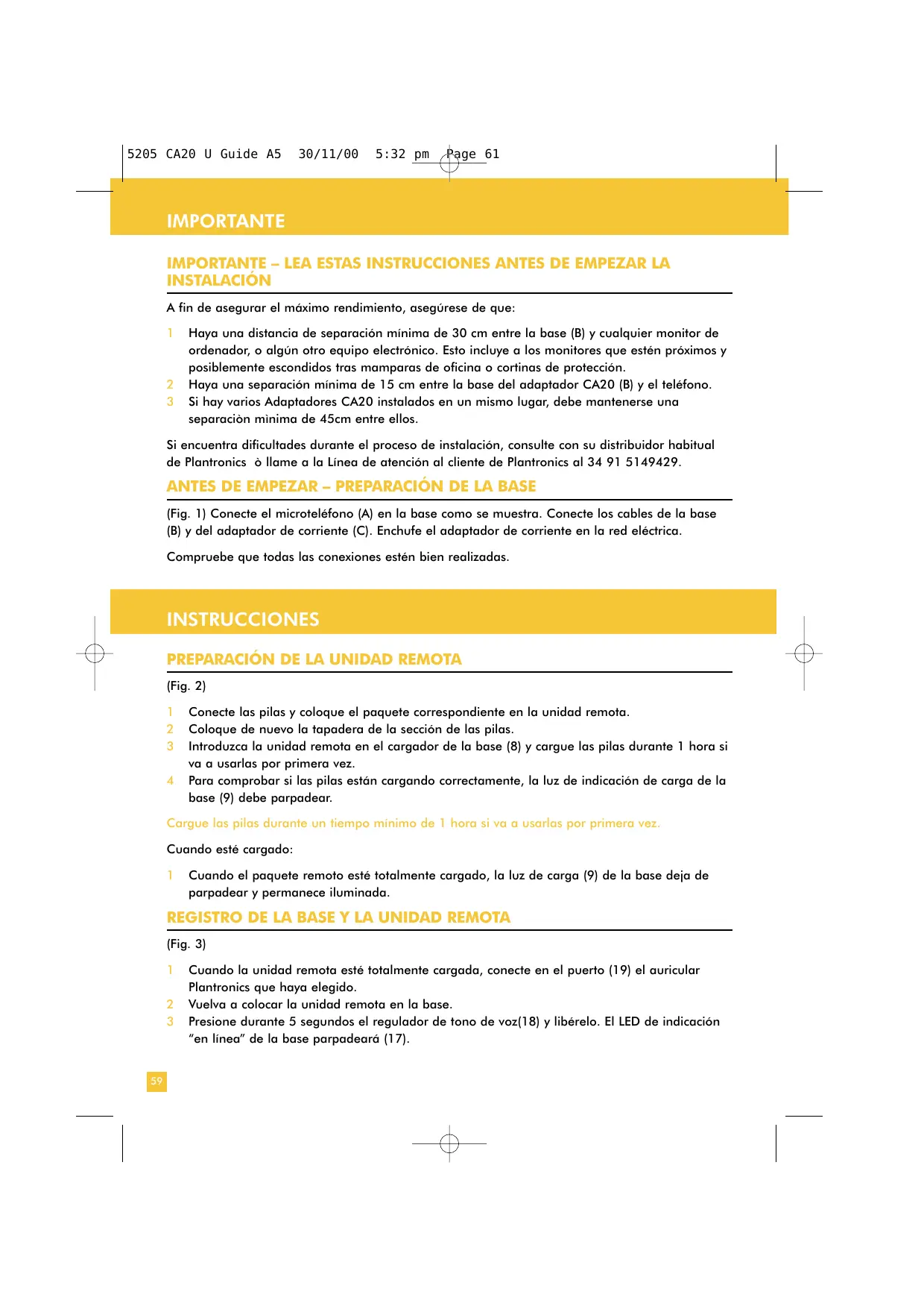 Haya una distancia de separación mínima de 30 cm entre la base (B) y cualquier monitor de ordenador, o algún otro equipo electrónico. Esto incluye a los monitores que estén próximos y posiblemente escondidos tras mamparas de oficina o cortinas de protección. Haya una separación mínima de 15 cm entre la base del adaptador CA20 (B) y el teléfono. Si hay varios Adaptadores CA20 instalados en un mismo lugar, debe mantenerse una separaciòn mìnima de 45cm entre ellos. Si encuentra dificultades durante el proceso de instalación, consulte con su distribuidor habitual de Plantronics ò llame a la Línea de atención al cliente de Plantronics al 34 91 5149429. ANTES DE EMPEZAR – PREPARACIÓN DE LA BASE (Fig. 1) Conecte el microteléfono (A) en la base como se muestra. Conecte los cables de la base (B) y del adaptador de corriente (C). Enchufe el adaptador de corriente en la red eléctrica. Compruebe que todas las conexiones estén bien realizadas. INSTRUCCIONES
