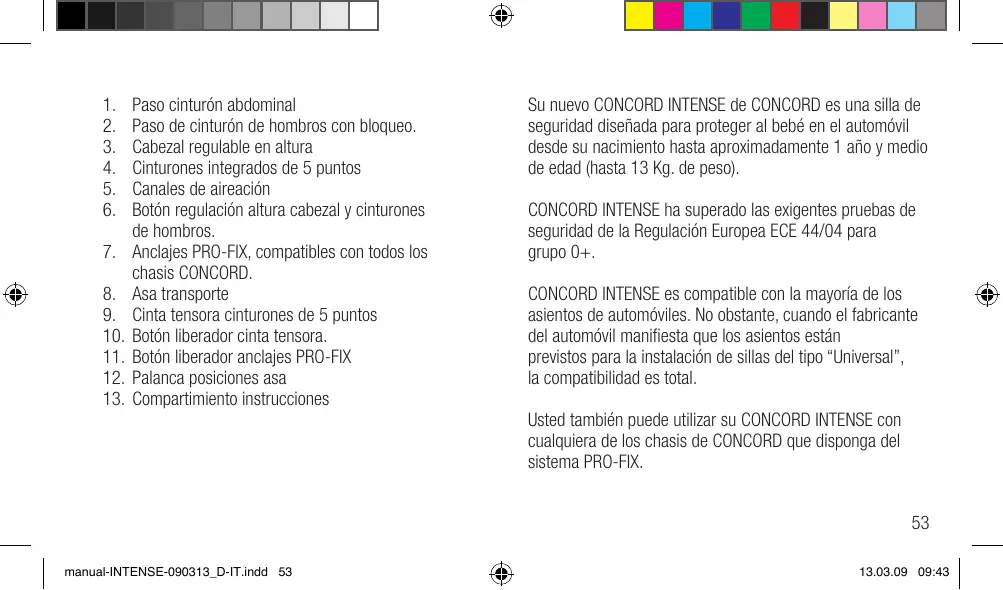 Paso cinturón abdominal Paso de cinturón de hombros con bloqueo. Cabezal regulable en altura Cinturones integrados de 5 puntos Canales de aireación Botón regulación altura cabezal y cinturones de hombros. Anclajes PRO-FIX, compatibles con todos los chasis CONCORD. Asa transporte Cinta tensora cinturones de 5 puntos Botón liberador cinta tensora. Botón liberador anclajes PRO-FIX Palanca posiciones asa Compartimiento instrucciones Su nuevo CONCORD INTENSE de CONCORD es una silla de seguridad diseñada para proteger al bebé en el automóvil desde su nacimiento hasta aproximadamente 1 año y medio de edad (hasta 13 Kg. de peso). CONCORD INTENSE ha superado las exigentes pruebas de seguridad de la Regulación Europea ECE 44/04 para grupo 0+. CONCORD INTENSE es compatible con la mayoría de los asientos de automóviles. No obstante, cuando el fabricante del automóvil manifiesta que los asientos están previstos para la instalación de sillas del tipo “Universal”, la compatibilidad es total. Usted también puede utilizar su CONCORD INTENSE con cualquiera de los chasis de CONCORD que disponga del sistema PRO-FIX.