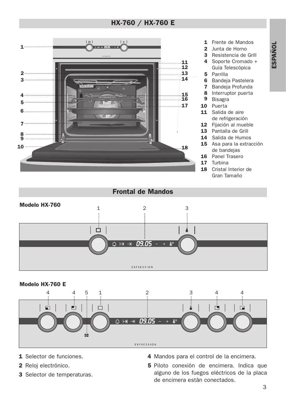 Frente de Mandos Junta de Horno Resistencia de Grill Soporte Cromado + Guía Telescópica Parrilla Bandeja Pastelera Bandeja Profunda Interruptor puerta Bisagra Puerta Salida de aire de refrigeración Fijación al mueble Pantalla de Grill Salida de Humos Asa para la extracción de bandejas Panel Trasero Turbina Cristal Interior de Gran Tamaño Frontal de Mandos Modelo HX-760