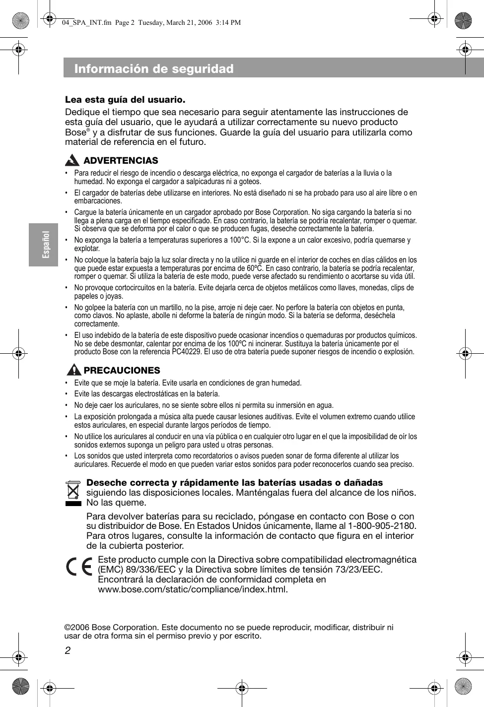 - Los sonidos que usted interpreta como recordatorios o avisos pueden sonar de forma diferente al utilizar los auriculares. Recuerde el modo en que pueden variar estos sonidos para poder reconocerlos cuando sea preciso. Deseche correcta y rápidamente las baterías usadas o dañadas siguiendo las disposiciones locales. Manténgalas fuera del alcance de los niños. No las queme. Para devolver baterías para su reciclado, póngase en contacto con Bose o con su distribuidor de Bose. En Estados Unidos únicamente, llame al 1-800-905-2180. Para otros lugares, consulte la información de contacto que figura en el interior de la cubierta posterior. Este producto cumple con la Directiva sobre compatibilidad electromagnética (EMC) 89/336/EEC y la Directiva sobre límites de tensión 73/23/EEC. Encontrará la declaración de conformidad completa en www.bose.com/static/compliance/index.html. ©2006 Bose Corporation. Este documento no se puede reproducir, modificar, distribuir ni usar de otra forma sin el permiso previo y por escrito.