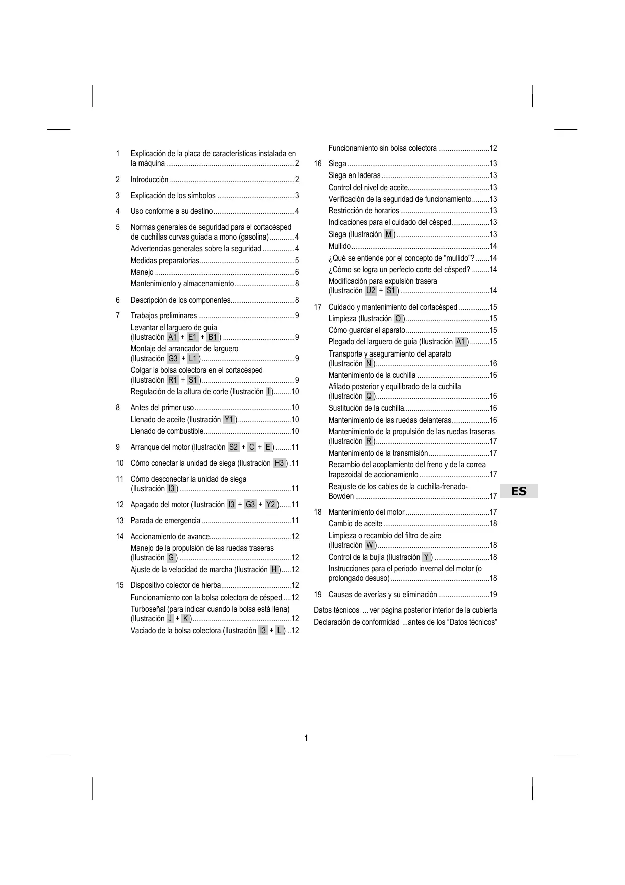 NORMAS GENERALES DE SEGURIDAD PARA EL CORTACÉSPED DE CUCHILLAS CURVAS GUIADA A MONO (GASOLINA) Advertencias generales sobre la seguridad Para su protección, así como para garantizar el funcionamiento de su máquina, lea minuciosamente las instrucciones de uso del mismo. Familiarícese con los elementos de mando, con objeto de emplear adecuadamente la máquina.