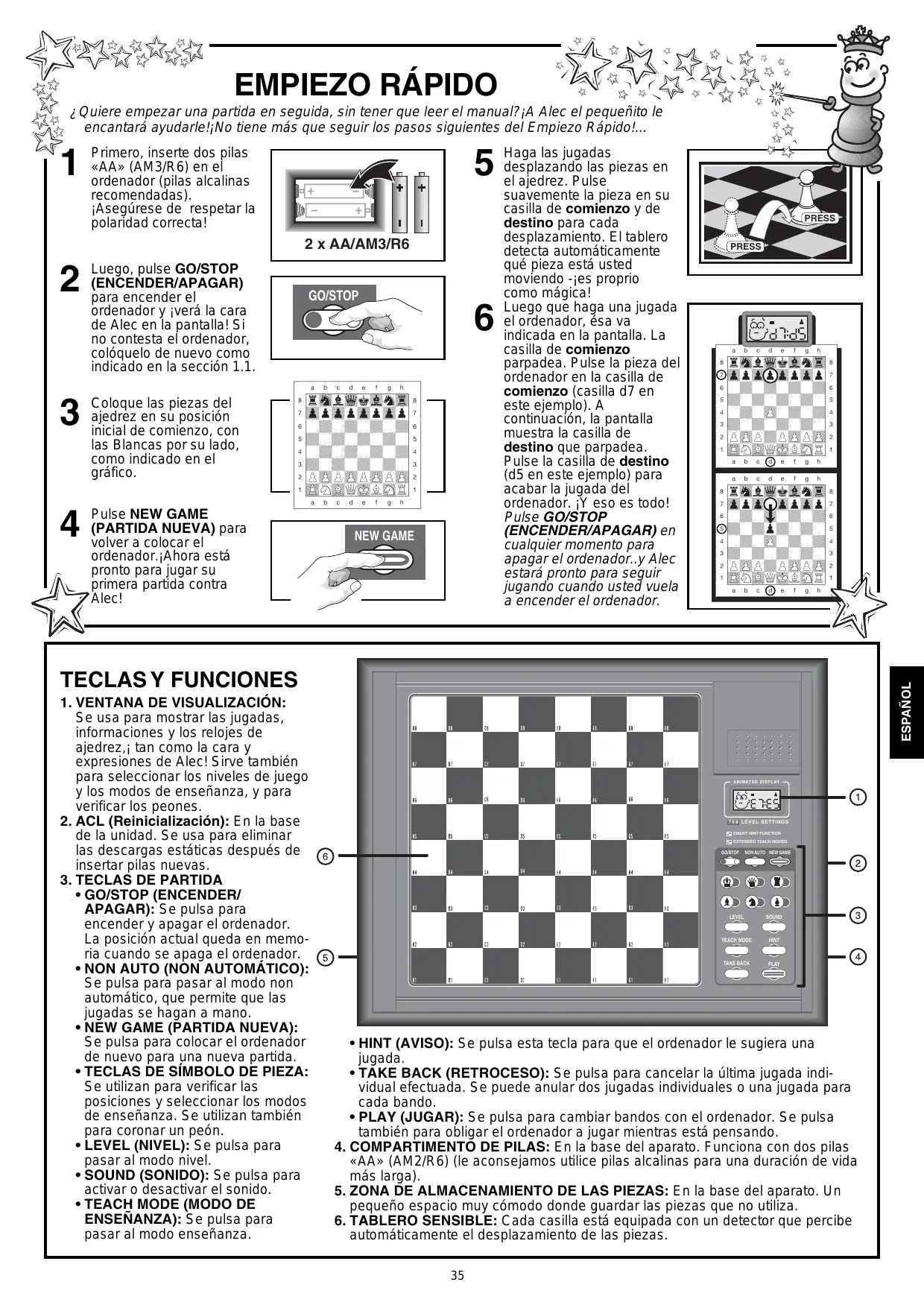 Se usa para mostrar las jugadas, informaciones y los relojes de ajedrez,¡ tan como la cara y expresiones de Alec! Sirve también para seleccionar los niveles de juego y los modos de enseñanza, y para verificar los peones. 2. ACL (Reinicialización): En la base de la unidad. Se usa para eliminar las descargas estáticas después de insertar pilas nuevas. 3. TECLAS DE PARTIDA • GO/STOP (ENCENDER/ APAGAR): Se pulsa para encender y apagar el ordenador. La posición actual queda en memoria cuando se apaga el ordenador. • NON AUTO (NON AUTOMÁTICO): Se pulsa para pasar al modo non automático, que permite que las jugadas se hagan a mano. • NEW GAME (PARTIDA NUEVA): Se pulsa para colocar el ordenador de nuevo para una nueva partida. • TECLAS DE SÍMBOLO DE PIEZA: Se utilizan para verificar las posiciones y seleccionar los modos de enseñanza. Se utilizan también para coronar un peón. • LEVEL (NIVEL): Se pulsa para pasar al modo nivel. • SOUND (SONIDO): Se pulsa para activar o desactivar el sonido. • TEACH MODE (MODO DE ENSEÑANZA): Se pulsa para pasar al modo enseñanza.