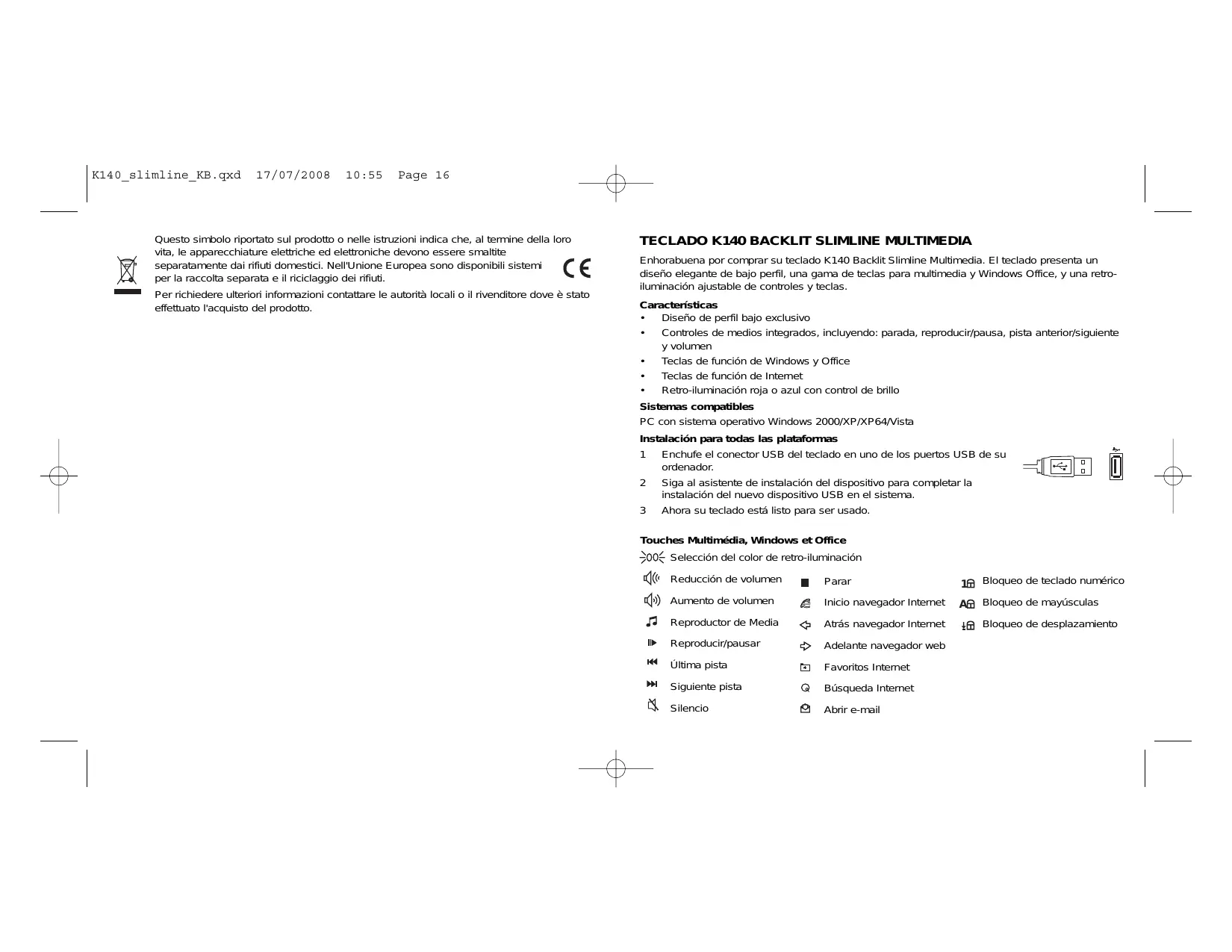TECLADO K140 BACKLIT SLIMLINE MULTIMEDIA Enhorabuena por comprar su teclado K140 Backlit Slimline Multimedia. El teclado presenta un diseño elegante de bajo perfil, una gama de teclas para multimedia y Windows Office, y una retroiluminación ajustable de controles y teclas. Características • Diseño de perfil bajo exclusivo • Controles de medios integrados, incluyendo: parada, reproducir/pausa, pista anterior/siguiente y volumen • Teclas de función de Windows y Office • Teclas de función de Internet • Retro-iluminación roja o azul con control de brillo Sistemas compatibles PC con sistema operativo Windows 2000/XP/XP64/Vista Instalación para todas las plataformas 1 Enchufe el conector USB del teclado en uno de los puertos USB e de su ordenador. 2 Siga al asistente de instalación del dispositivo para completar la instalación del nuevo dispositivo USB en el sistema. 3 Ahora su teclado está listo para ser usado. Touches Multimédia, Windows et Office Selección del color de retro-iluminación Reducción de volumen Aumento de volumen