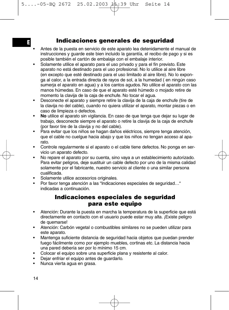 - Solamente utilise el aparato para el uso privado y para el fin previsto. Este aparato no está destinado para el uso profesional. No lo utilise al aire libre (en excepto que estádestinado para el uso limitado al aire libre).No lo expon-ga al calor, a la entrada directa de rayos de sol, a la humedad ( en ningún casosumerja el aparato en agua) y a los cantos agudos. No utilise el aparato con las manos humedas. En caso de que el aparato está humedo o要去 retire de momento la clavija de la caja de enchufe. No tocar el agua.