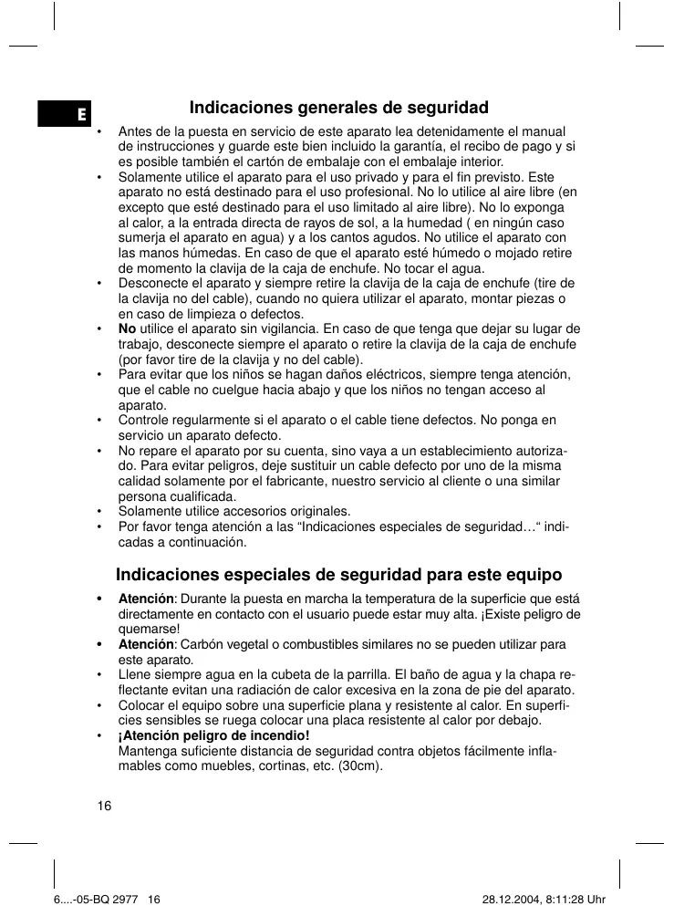 - Solamente utilise el aparato para el uso privado y para el fin previsto. Este aparato no está destinado para el uso profesional. No lo utilise al aire libre (en excepto que estédestinedadapreleuolo limitadoal airelibre).No lo exponga al calor, a la entrada directa de rayos de sol, a la humedad ( en ningún caso sumerja el aparato en agua) y a los cantos agudos. No utilise el aparato con las manos humedes. En caso de que el aparato esté humedo o mojado retire de momento la clavija de la caja de enchufe. No tocar el agua.