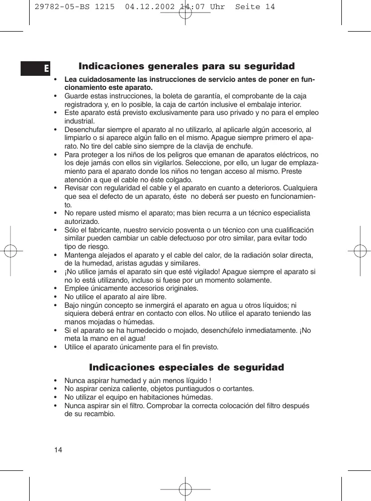 Guarde estas instrucciones, la boleta de garantía, el comprobante de la caja registradora y, en lo posible, la caja de cartón inclusive el embalaje interior. Este aparato está previsto exclusivamente para uso privado y no para el empleo industrial. Desenchufar siempre el aparato al no utilizarlo, al aplicarle algún accesorio, al limpiarlo o si aparece algún fallo en el mismo. Apague siempre primero el aparato. No tire del cable sino siempre de la clavija de enchufe. Para proteger a los niños de los peligros que emanan de aparatos eléctricos, no los deje jamás con ellos sin vigilarlos. Seleccione, por ello, un lugar de emplazamiento para el aparato donde los niños no tengan acceso al mismo. Preste atención a que el cable no éste colgado. Revisar con regularidad el cable y el aparato en cuanto a deterioros. Cualquiera que sea el defecto de un aparato, éste no deberá ser puesto en funcionamiento. No repare usted mismo el aparato; mas bien recurra a un técnico especialista autorizado. Sólo el fabricante, nuestro servicio posventa o un técnico con una cualificación similar pueden cambiar un cable defectuoso por otro similar, para evitar todo tipo de riesgo. Mantenga alejados el aparato y el cable del calor, de la radiación solar directa, de la humedad, aristas agudas y similares. ¡No utilice jamás el aparato sin que esté vigilado! Apague siempre el aparato si no lo está utilizando, incluso si fuese por un momento solamente. Emplee únicamente accesorios originales. No utilice el aparato al aire libre. Bajo ningún concepto se inmergirá el aparato en agua u otros líquidos; ni siquiera deberá entrar en contacto con ellos. No utilice el aparato teniendo las manos mojadas o húmedas. Si el aparato se ha humedecido o mojado, desenchúfelo inmediatamente. ¡No meta la mano en el agua! Utilice el aparato únicamente para el fin previsto.