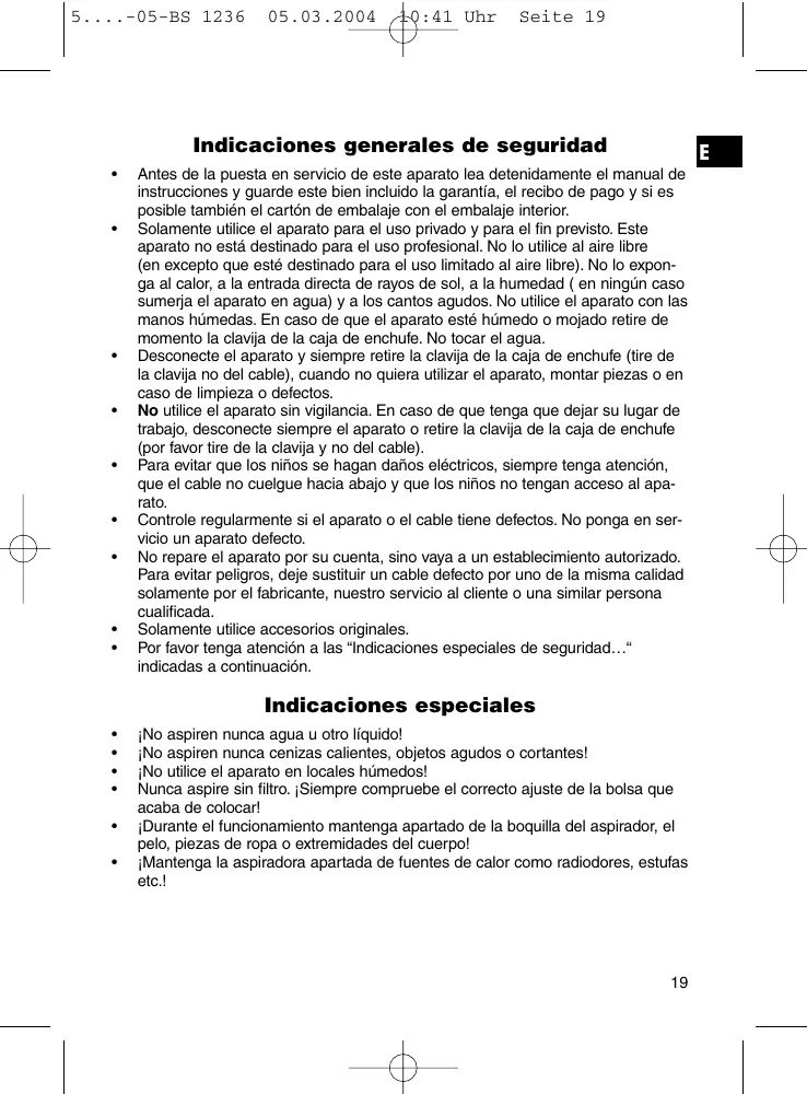 ¡No aspiren nunca cenizas calientes, objetos agudos o cortantes! ¡No utilice el aparato en locales húmedos! Nunca aspire sin filtro. ¡Siempre compruebe el correcto ajuste de la bolsa que acaba de colocar! ¡Durante el funcionamiento mantenga apartado de la boquilla del aspirador, el pelo, piezas de ropa o extremidades del cuerpo! ¡Mantenga la aspiradora apartada de fuentes de calor como radiodores, estufas etc.!
