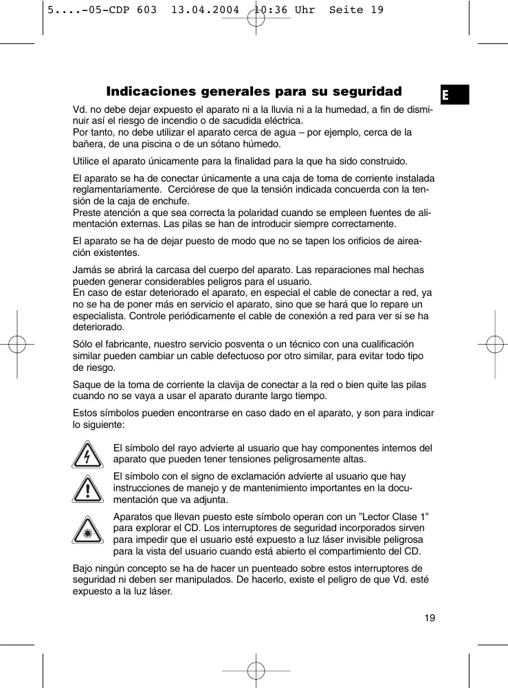 Aparatos queLVan puestoeste symbolooperan con un "Lector Clase 1" para explorar el CD. Los interruptores de seguidur incorpordados sirven para impedir que el usuario este expuesto a luz laser invisible peligrosa para la vista del usuario cuando está abierto el compartmentido del CD.