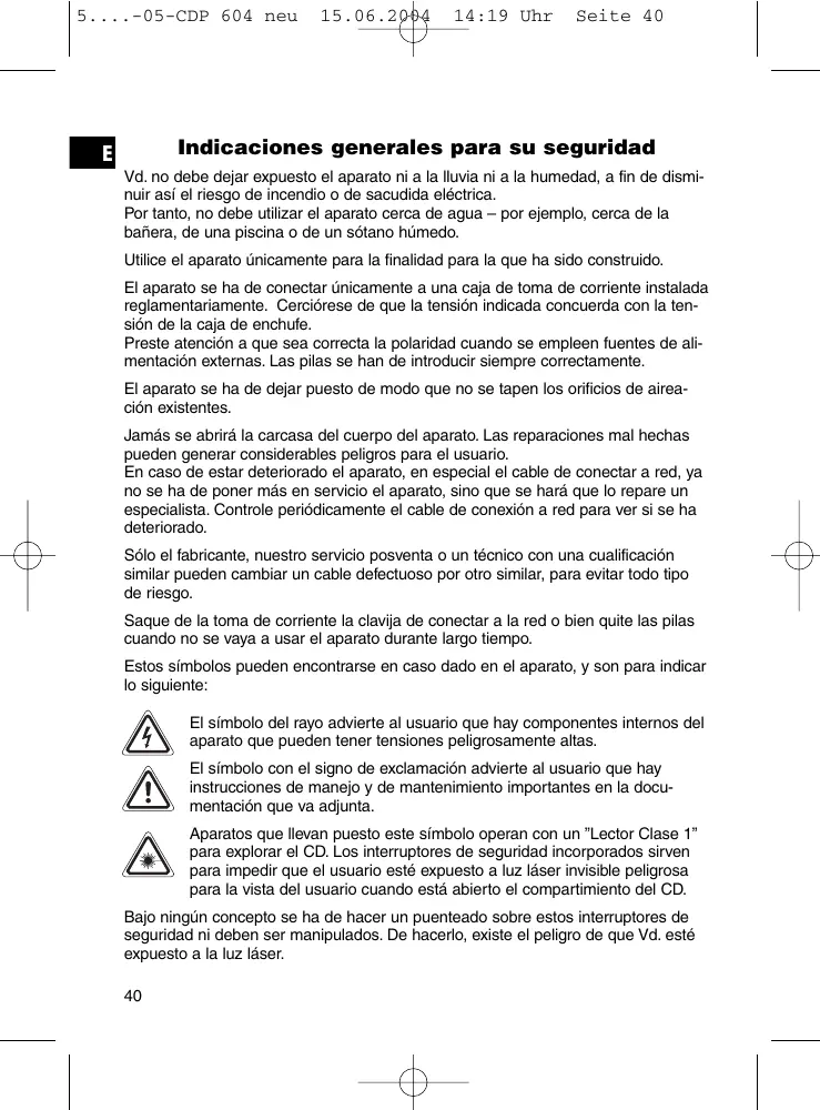 Aparatos que搬家 esta SYMBOL operan con un "Lector Clase 1" para explorar el CD. Los interruptores de seguridad incorpordados sirven para impeder que el usuario esté expuesto a luz láser invisible peligrosa para la vista del usuario cuando está abierto el compartmentido del CD.