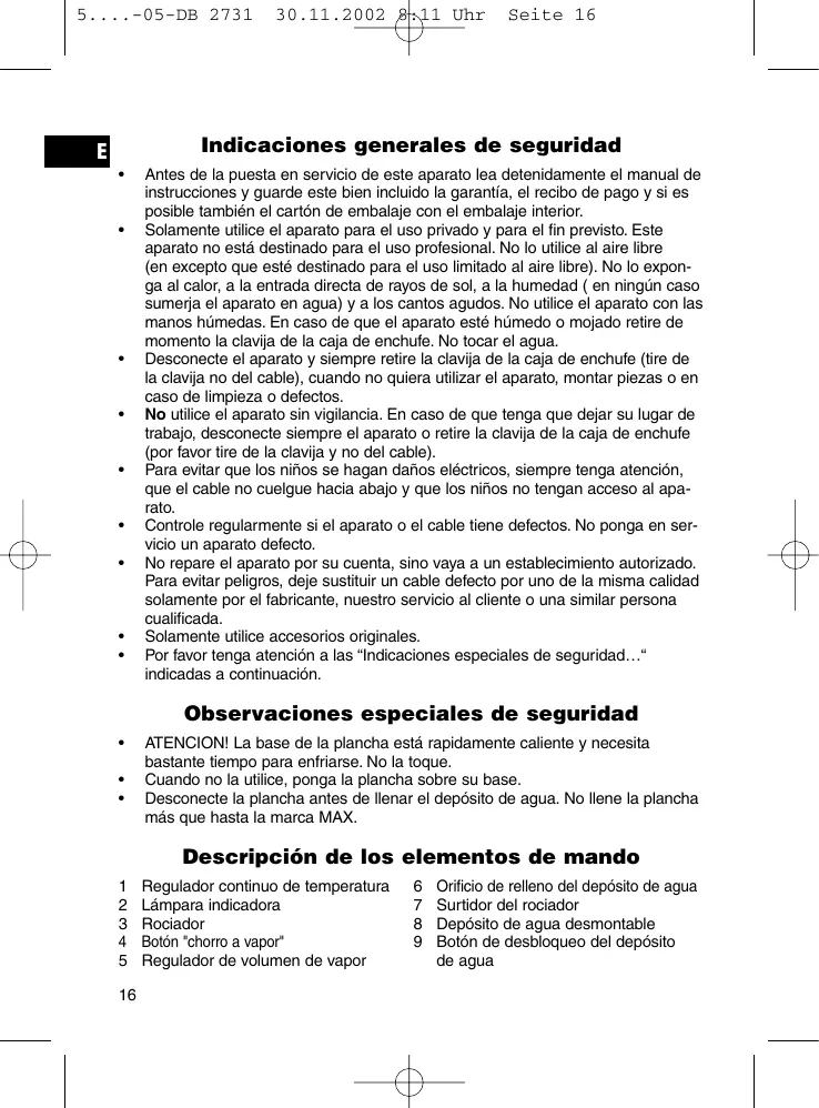 Solamente utilice el aparato para el uso privado y para el fin previsto. Este aparato no está destinado para el uso profesional. No lo utilice al aire libre (en excepto que esté destinado para el uso limitado al aire libre). No lo exponga al calor, a la entrada directa de rayos de sol, a la humedad ( en ningún caso sumerja el aparato en agua) y a los cantos agudos. No utilice el aparato con las manos húmedas. En caso de que el aparato esté húmedo o mojado retire de momento la clavija de la caja de enchufe. No tocar el agua. Desconecte el aparato y siempre retire la clavija de la caja de enchufe (tire de la clavija no del cable), cuando no quiera utilizar el aparato, montar piezas o en caso de limpieza o defectos. No utilice el aparato sin vigilancia. En caso de que tenga que dejar su lugar de trabajo, desconecte siempre el aparato o retire la clavija de la caja de enchufe (por favor tire de la clavija y no del cable). Para evitar que los niños se hagan daños eléctricos, siempre tenga atención, que el cable no cuelgue hacia abajo y que los niños no tengan acceso al aparato. Controle regularmente si el aparato o el cable tiene defectos. No ponga en servicio un aparato defecto. No repare el aparato por su cuenta, sino vaya a un establecimiento autorizado. Para evitar peligros, deje sustituir un cable defecto por uno de la misma calidad solamente por el fabricante, nuestro servicio al cliente o una similar persona cualificada. Solamente utilice accesorios originales. Por favor tenga atención a las “Indicaciones especiales de seguridad…“ indicadas a continuación.