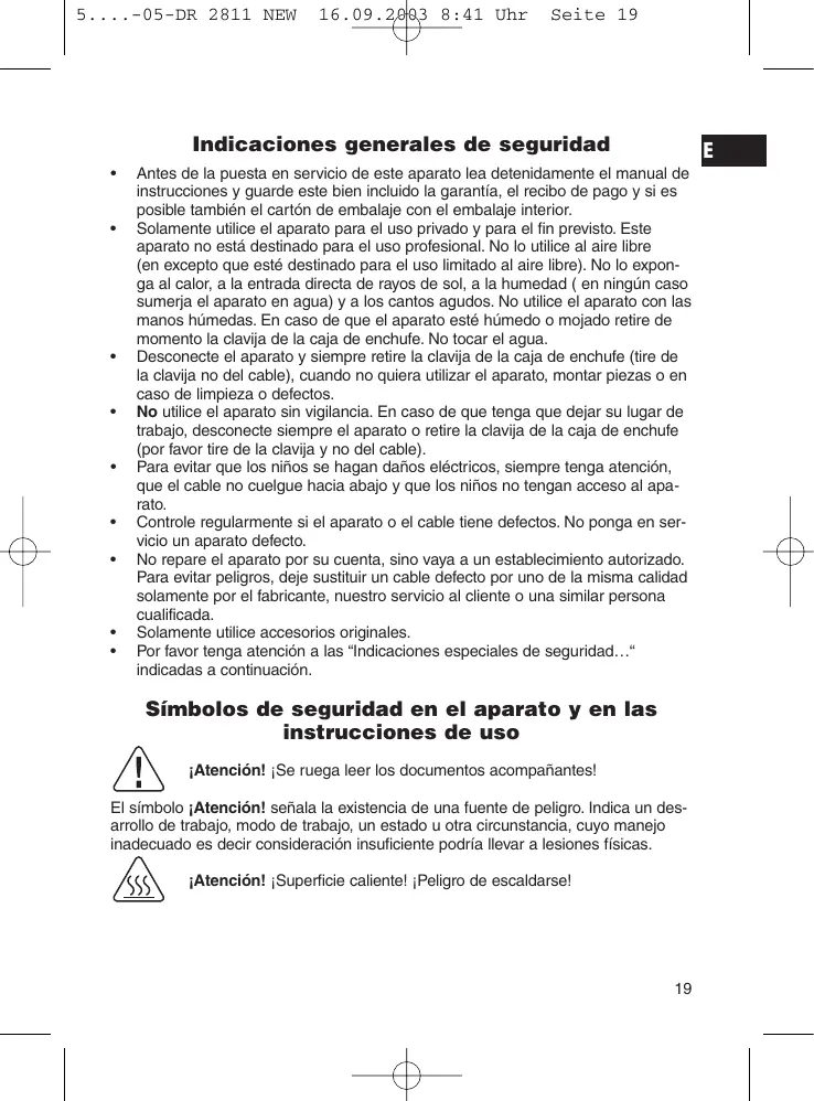 Antes de la puesta en servicio de este aparato lea detenidamente el manual de instrucciones y guarde este bien incluido la garantía, el recibo de pago y si es posible también el cartón de embalaje con el embalaje interior. Solamente utilice el aparato para el uso privado y para el fin previsto. Este aparato no está destinado para el uso profesional. No lo utilice al aire libre (en excepto que esté destinado para el uso limitado al aire libre). No lo exponga al calor, a la entrada directa de rayos de sol, a la humedad ( en ningún caso sumerja el aparato en agua) y a los cantos agudos. No utilice el aparato con las manos húmedas. En caso de que el aparato esté húmedo o mojado retire de momento la clavija de la caja de enchufe. No tocar el agua. Desconecte el aparato y siempre retire la clavija de la caja de enchufe (tire de la clavija no del cable), cuando no quiera utilizar el aparato, montar piezas o en caso de limpieza o defectos. No utilice el aparato sin vigilancia. En caso de que tenga que dejar su lugar de trabajo, desconecte siempre el aparato o retire la clavija de la caja de enchufe (por favor tire de la clavija y no del cable). Para evitar que los niños se hagan daños eléctricos, siempre tenga atención, que el cable no cuelgue hacia abajo y que los niños no tengan acceso al aparato. Controle regularmente si el aparato o el cable tiene defectos. No ponga en servicio un aparato defecto. No repare el aparato por su cuenta, sino vaya a un establecimiento autorizado. Para evitar peligros, deje sustituir un cable defecto por uno de la misma calidad solamente por el fabricante, nuestro servicio al cliente o una similar persona cualificada. Solamente utilice accesorios originales. Por favor tenga atención a las “Indicaciones especiales de seguridad…“ indicadas a continuación. Símbolos de seguridad en el aparato y en las instrucciones de uso ¡Atención! ¡Se ruega leer los documentos acompañantes! El símbolo ¡Atención! señala la existencia de una fuente de peligro. Indica un desarrollo de trabajo, modo de trabajo, un estado u otra circunstancia, cuyo manejo inadecuado es decir consideración insuficiente podría llevar a lesiones físicas. ¡Atención! ¡Superficie caliente! ¡Peligro de escaldarse!