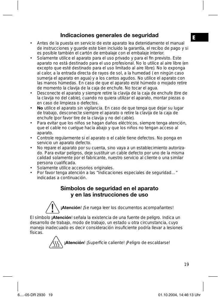 Antes de la puesta en servicio de este aparato lea detenidamente el manual de instrucciones y guarde este bien incluido la garantía, el recibo de pago y si es posible también el cartón de embalaje con el embalaje interior. Solamente utilice el aparato para el uso privado y para el fin previsto. Este aparato no está destinado para el uso profesional. No lo utilice al aire libre (en excepto que esté destinado para el uso limitado al aire libre). No lo exponga al calor, a la entrada directa de rayos de sol, a la humedad ( en ningún caso sumerja el aparato en agua) y a los cantos agudos. No utilice el aparato con las manos húmedas. En caso de que el aparato esté húmedo o mojado retire de momento la clavija de la caja de enchufe. No tocar el agua. Desconecte el aparato y siempre retire la clavija de la caja de enchufe (tire de la clavija no del cable), cuando no quiera utilizar el aparato, montar piezas o en caso de limpieza o defectos. No utilice el aparato sin vigilancia. En caso de que tenga que dejar su lugar de trabajo, desconecte siempre el aparato o retire la clavija de la caja de enchufe (por favor tire de la clavija y no del cable). Para evitar que los niños se hagan daños eléctricos, siempre tenga atención, que el cable no cuelgue hacia abajo y que los niños no tengan acceso al aparato. Controle regularmente si el aparato o el cable tiene defectos. No ponga en servicio un aparato defecto. No repare el aparato por su cuenta, sino vaya a un establecimiento autorizado. Para evitar peligros, deje sustituir un cable defecto por uno de la misma calidad solamente por el fabricante, nuestro servicio al cliente o una similar persona cualificada. Solamente utilice accesorios originales. Por favor tenga atención a las “Indicaciones especiales de seguridad…“ indicadas a continuación. Símbolos de seguridad en el aparato y en las instrucciones de uso ¡Atención! ¡Se ruega leer los documentos acompañantes! El símbolo ¡Atención! señala la existencia de una fuente de peligro. Indica un desarrollo de trabajo, modo de trabajo, un estado u otra circunstancia, cuyo manejo inadecuado es decir consideración insuficiente podría llevar a lesiones físicas. ¡Atención! ¡Superficie caliente! ¡Peligro de escaldarse!
