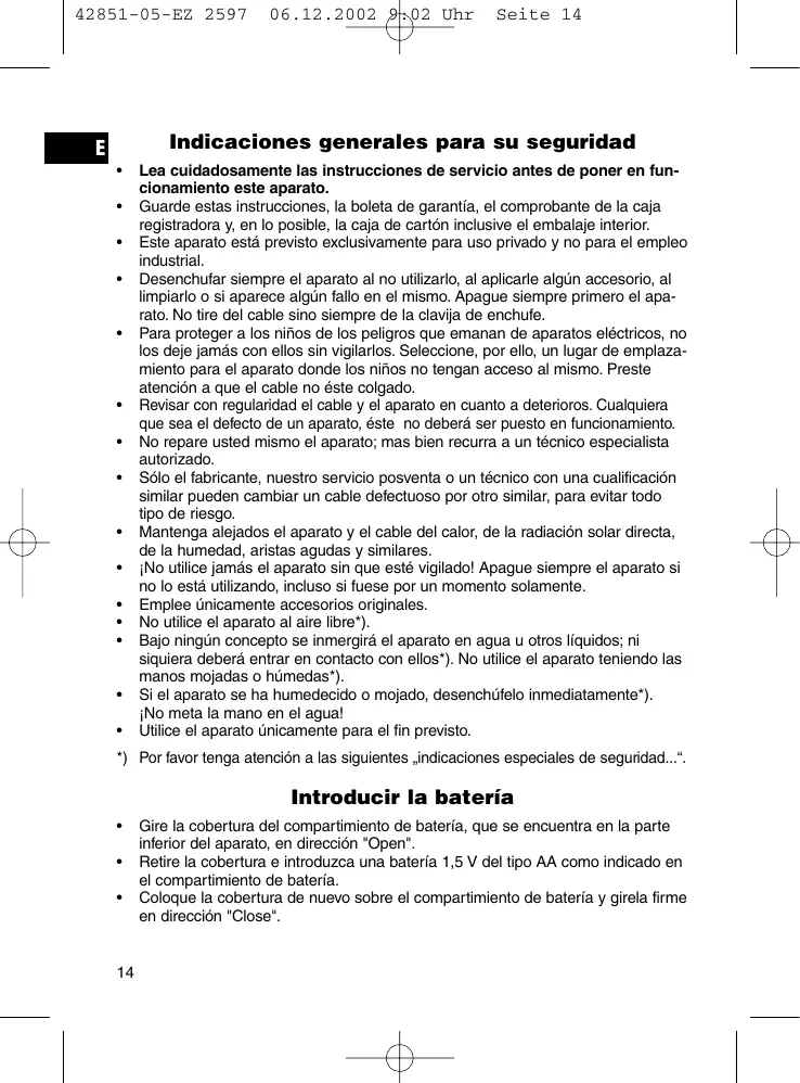 Guarde estas instrucciones, la boleta de garantía, el comprobante de la caja registradora y, en lo posible, la caja de cartón inclusive el embalaje interior. Este aparato está previsto exclusivamente para uso privado y no para el empleo industrial. Desenchufar siempre el aparato al no utilizarlo, al aplicarle algún accesorio, al limpiarlo o si aparece algún fallo en el mismo. Apague siempre primero el aparato. No tire del cable sino siempre de la clavija de enchufe. Para proteger a los niños de los peligros que emanan de aparatos eléctricos, no los deje jamás con ellos sin vigilarlos. Seleccione, por ello, un lugar de emplazamiento para el aparato donde los niños no tengan acceso al mismo. Preste atención a que el cable no éste colgado. Revisar con regularidad el cable y el aparato en cuanto a deterioros. Cualquiera que sea el defecto de un aparato, éste no deberá ser puesto en funcionamiento. No repare usted mismo el aparato; mas bien recurra a un técnico especialista autorizado. Sólo el fabricante, nuestro servicio posventa o un técnico con una cualificación similar pueden cambiar un cable defectuoso por otro similar, para evitar todo tipo de riesgo. Mantenga alejados el aparato y el cable del calor, de la radiación solar directa, de la humedad, aristas agudas y similares. ¡No utilice jamás el aparato sin que esté vigilado! Apague siempre el aparato si no lo está utilizando, incluso si fuese por un momento solamente. Emplee únicamente accesorios originales. No utilice el aparato al aire libre*). Bajo ningún concepto se inmergirá el aparato en agua u otros líquidos; ni siquiera deberá entrar en contacto con ellos*). No utilice el aparato teniendo las manos mojadas o húmedas*). Si el aparato se ha humedecido o mojado, desenchúfelo inmediatamente*). ¡No meta la mano en el agua! Utilice el aparato únicamente para el fin previsto.