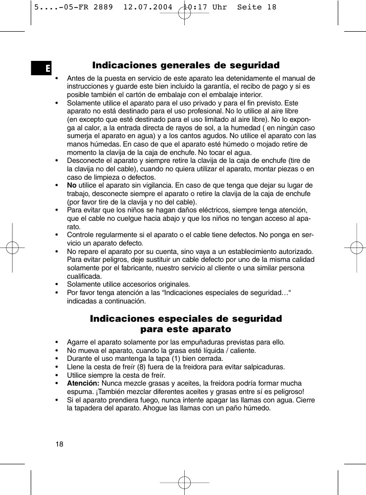 Antes de la puesta en servicio de este aparato lea detenidamente el manual de instrucciones y guarde este bien incluido la garantía, el recibo de pago y si es posible también el cartón de embalaje con el embalaje interior. Solamente utilice el aparato para el uso privado y para el fin previsto. Este aparato no está destinado para el uso profesional. No lo utilice al aire libre (en excepto que esté destinado para el uso limitado al aire libre). No lo exponga al calor, a la entrada directa de rayos de sol, a la humedad ( en ningún caso sumerja el aparato en agua) y a los cantos agudos. No utilice el aparato con las manos húmedas. En caso de que el aparato esté húmedo o mojado retire de momento la clavija de la caja de enchufe. No tocar el agua. Desconecte el aparato y siempre retire la clavija de la caja de enchufe (tire de la clavija no del cable), cuando no quiera utilizar el aparato, montar piezas o en caso de limpieza o defectos. No utilice el aparato sin vigilancia. En caso de que tenga que dejar su lugar de trabajo, desconecte siempre el aparato o retire la clavija de la caja de enchufe (por favor tire de la clavija y no del cable). Para evitar que los niños se hagan daños eléctricos, siempre tenga atención, que el cable no cuelgue hacia abajo y que los niños no tengan acceso al aparato. Controle regularmente si el aparato o el cable tiene defectos. No ponga en servicio un aparato defecto. No repare el aparato por su cuenta, sino vaya a un establecimiento autorizado. Para evitar peligros, deje sustituir un cable defecto por uno de la misma calidad solamente por el fabricante, nuestro servicio al cliente o una similar persona cualificada. Solamente utilice accesorios originales. Por favor tenga atención a las “Indicaciones especiales de seguridad…“ indicadas a continuación. Indicaciones especiales de seguridad para este aparato