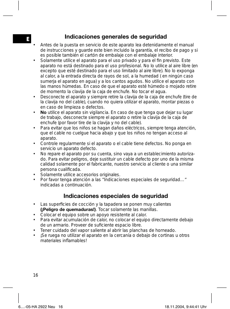 - Antes de lapella en service de este aparato lea detenidamente el manuel de instrucciones y guarde este bien inclido la garantía, el recibo de pago y si es possible también el carton de embalaje con el embalaje inferior.