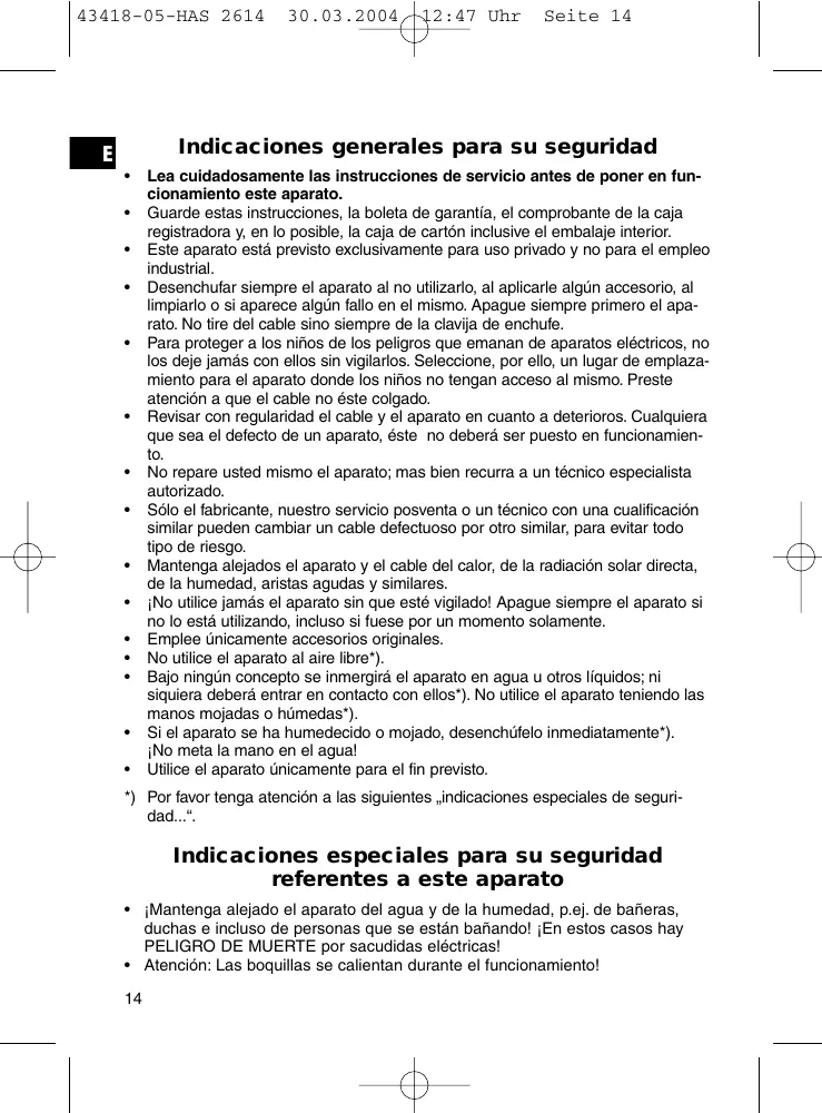 • ¡Mantenga alejado el aparato del agua y de la humedad, p.ej. de bañeras, duchas e incluso de personas que se están bañando! ¡En estos casos hay PELIGRO DE MUERTE por sacudidas eléctricas! • Atención: Las boquillas se calientan durante el funcionamiento! 14