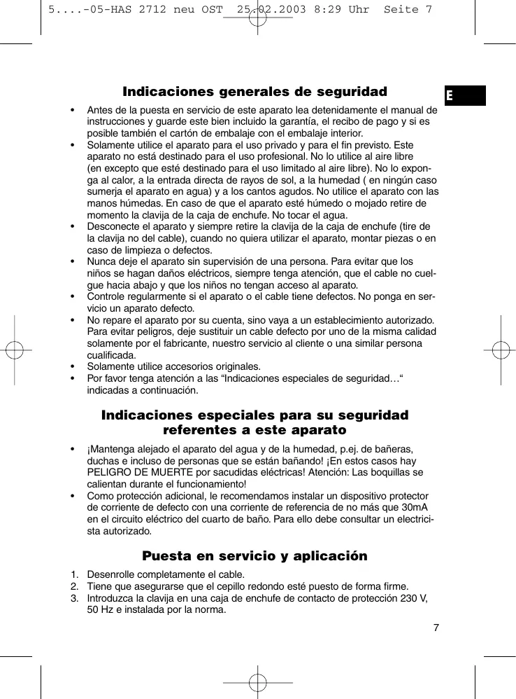 - Solamente utilise el aparato para el uso privado y para el fin previsto. Este aparato no está destinado para el uso profesional. No lo utilise al aire libre (en excepto que está选址rado para el uso limitado al aire libre). No lo exponga al calor, a la entrada directa de rayos de sol, a la humedad (en ningún casosumerj el aparato en agua) y a los cantos agudos. No utilise el aparato con las manos humidas. En caso de que el aparato está humedo o mojado retire de momento la clavija de la caja de enchufe. No tocar el agua.