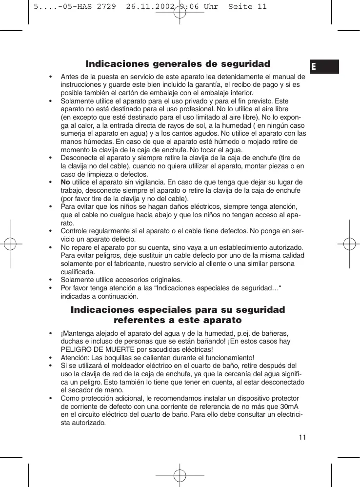 - Si se utilizes el moldeador electrico en el cuarto de bajo, retire afterwards del uso la clavija de red de la caja de enchufe, ya que la cercanía del agua significa un peligro. Esto también lo Tiene que tener en cuenta, al estar desconectado el secador de mano.